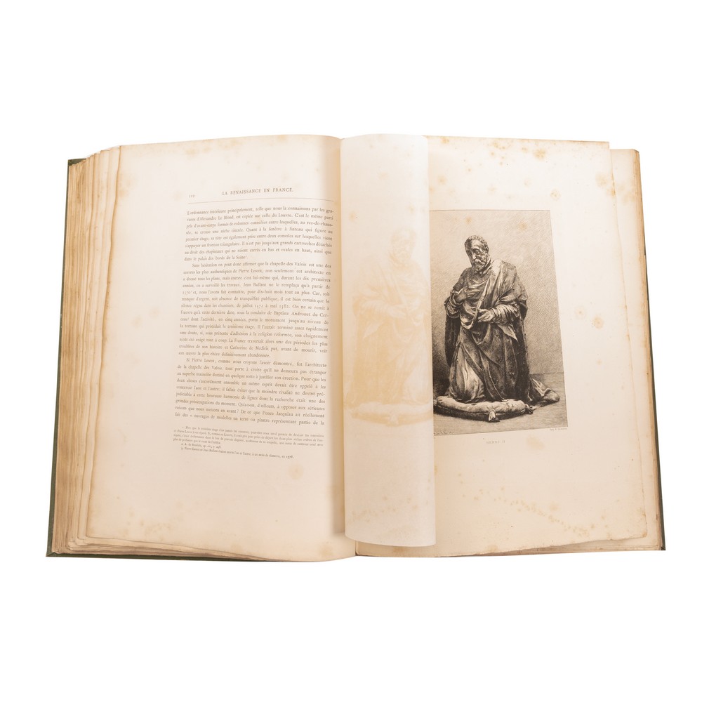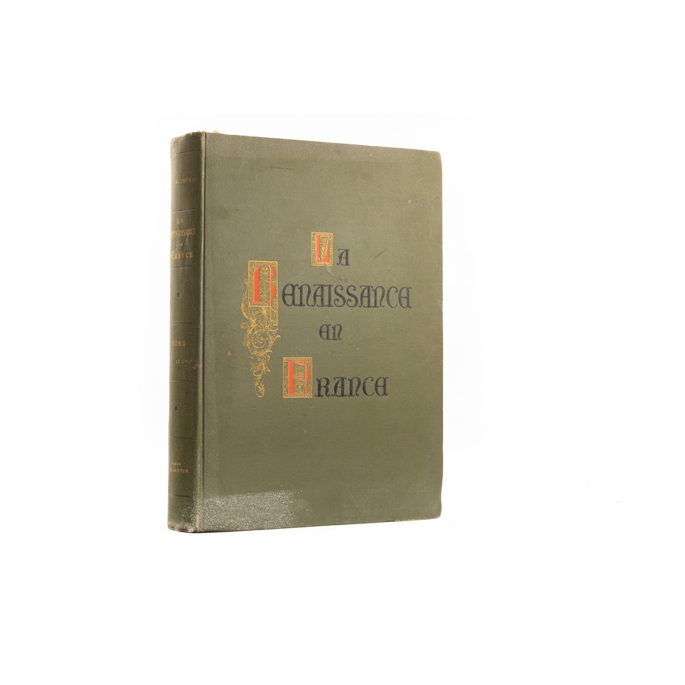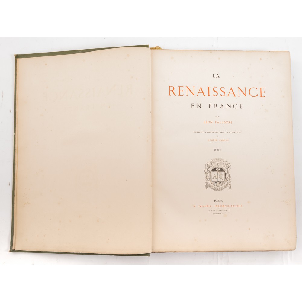 Leon Palustre LA RENAISSANCE EN FRANCE, ed. Paris, A. Quantin MDCCCLXXXI. Disegni e incisioni sotto la direzione di Eugene Sadoux. Tomo II. In folio. Bella legatura editoriale in piena tela verde rigida con incisioni a caldo in oro delle iniziali decorate del titolo. Tagli marginosi e irregolari. Tavole calcografiche nel testo e a piena pagina fuori testo protette da velina. Qualche sporcizia ai piatti e al dorso. Tagli impolverati. Pagine interne in ottimo stato di conservazione. Pp. 324 (2) oltre le tavole f.t.