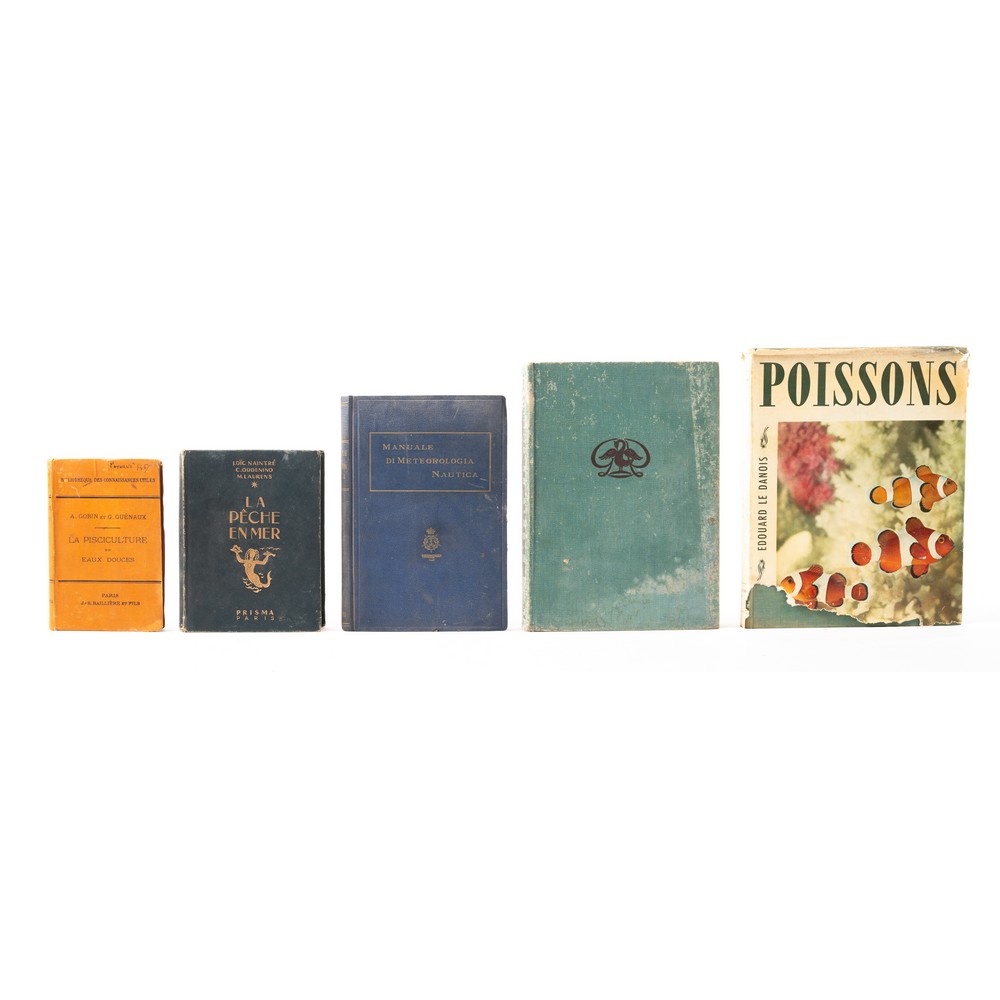 CINQUE VOLUMI DI PESCICOLTURA, NAUTICA E PESCA: 1) A. Gobin / G. Guenaux LA PISCICULTURE EN EAUX DOUCES, Paris Bailliere et Fils 1907. In 16°. Legatura editoriale rigida telata. Con note manoscritte di possesso. Pagine brunite dal tempo. Opera in buone condizioni. Pp. 348 (14). 2) AA. VV. LA PECHE EN MER, ed. Les Editions Prisma, Paris 1948. Petite Encyclopedie Prisma de la Peche publiee sous la direction de Tony Burnand. In 8° piccolo. Bella legatura editoriale in piena tela rigida con titoli e sirena marina impressi in oro al piatto e titoli in oro al dorso. tagli fioriti. Qualche sporadica gora e macchioline. Opera nel complesso in ottime condizioni. Pp. 371 con un apparato di foto e immagini in b/n n. t. e f. t. 3) Istituto Idrografico della Regia Marina MANUALE DI METEOROLOGIA NAUTICA, ed. Genova, Tipolitografia dell’Istituto Idrografico della R. Marina 1935 – Anno XIII. Testo per la R. Accademia Navale. Legatura editoriale in piena tela rigida con titoli e stemma della Regia Accademia in oro al piatto e titoli in oro al dorso. qualche usura d’uso ai piatti. Pp. XV, 290. 4) Edouard Danois POISSONS, ed. Paris, Horizons de France 1956. In 4°. Legatura editoriale in piena tela rigida con sopraccoperta editoriale illustrata. Sporcizie e usure alla sopraccoperta. Pp. 191. 5) AA. VV. THE STANDARD BOOK OF FISHING (ANA ABRIDGEMENT OF THE FISHERMAN’S ENCYCLOPEDIA, ed. The Greystone Press, New York 1950. In 8° grande. Legatura editoriale in piena tela. Usure e sporcizie. Pp. 532.