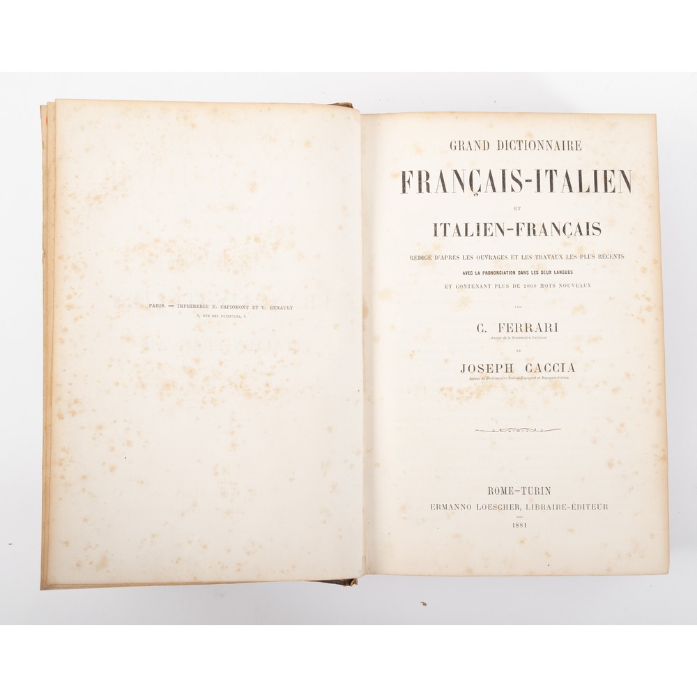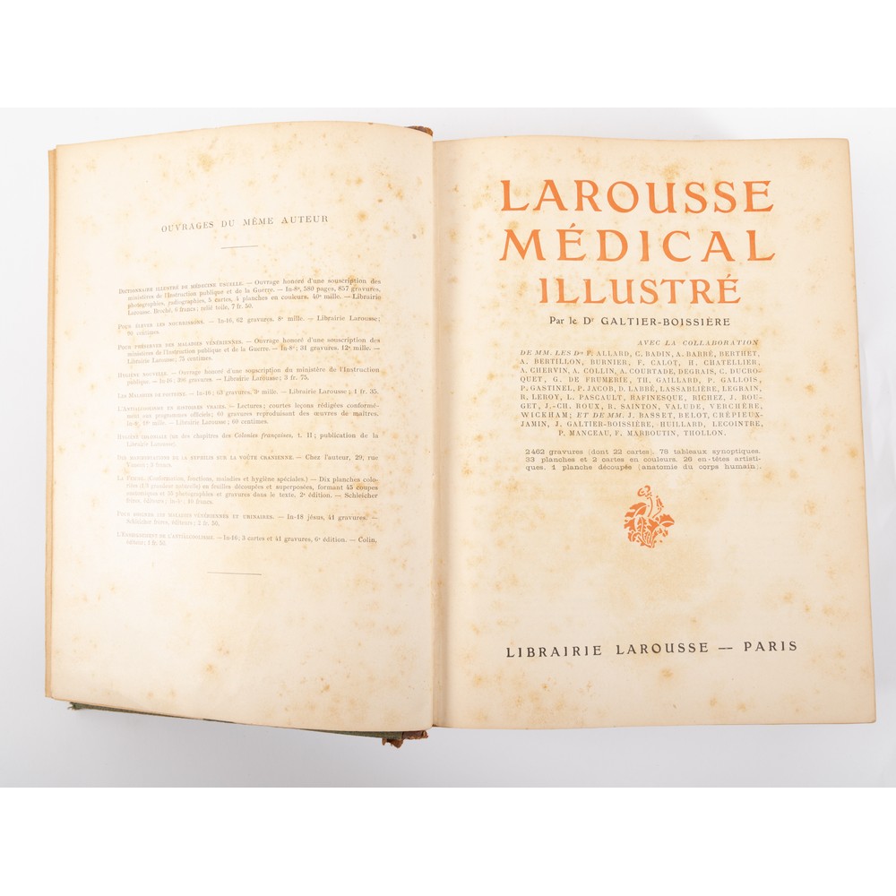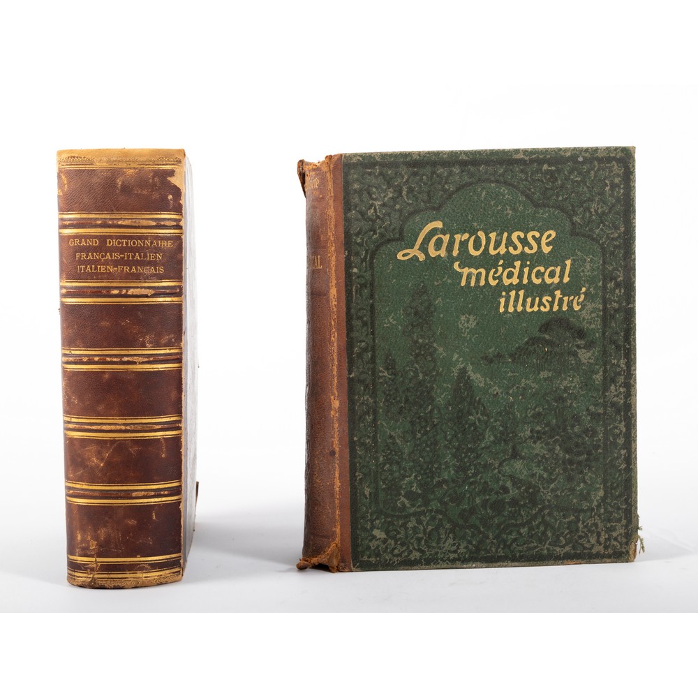 DUE VOLUMI DI VARIA: 1) AA. VV. LAROUSSE MEDICAL ILLUSTRE’, ed. Larousse 1912. In 4°. Bella legatura ina mezza pelle, con titoli e fregi in oro e a secco al piatto e al dorso. Piatti telati. Normali usure d’uso. In ottimo stato di conservazione. Pp. 1294, 2462; con illustrazioni, 78 tavole sinottiche, 33 tavole, 2 carte a colori e 3 tav. del corpo umano animate. 2) C. Ferrari / J. Caccia GRAND DICTIONNAIRE FRANCIS – ITALIEN ET ITELIEN – FRANCAIS, ed. Rome -Tourin Ermanno Loescher 1881. In 4°. Due parti in un volume unico. Solida ed elegante legatura coeva in mezza pelle con angoli e piatti marmorizzati. Titoli e filetti in oro al dorso. cinque nervature al dorso. Tagli colorati. Contropiatti e fogli di risguardia rigidi floreali. Esemplare in ottimo stato di conservazione, salc le normali usure d’uso. Pp. XII, 778; XII, 1000.