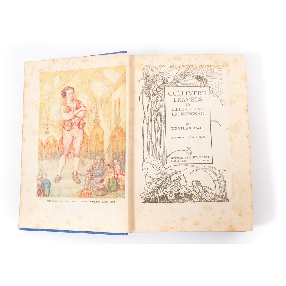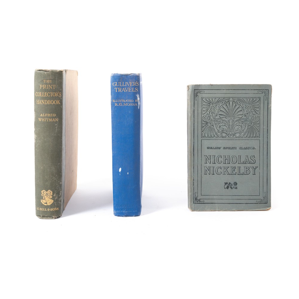 TRE VOLUMI D’ARTE E LETTERATURA IN LINGUA INGLESE: 1) Alfred Whitman THE PRINT-COLLECTOR’S HANDBOOKA, ed. London, George Bell & Son 1907. In 8°. Legatura editoriale in piena tela rigida. Titoli e fregi impressi in oro al dorso. in antiporta immagine di Mrs Carnac protetta da velina. Ex libris con stemma di famiglia del Principe di Trabia a di Butera al contropiatto. In ottime condizioni. Pp. 164 oltre 80 illustrazioni f.t.2) Charles Dickens NICHOLAS NICKLEBY, ed. London, Collins’ Clear – Type s. d. Illustrazione in antiporta. Stampato su due colonne. Legatura editoriale in pieno cartonato telato rigido. In ottime condizioni.note manoscritte di possesso di Giovanna Lanza di Trabia. Pp. 382. 3) Jonathan Swift GULLIVER’S TRAVEL TO LILLIPUT AND BROBDINGNAG, ed. London, Hodder and Stroughton s.d. Opera illustrata da R. G. Mossa. In 8°. Legatura editoriale in piena tela rigida con cornice impressa a secco al piatto e titoli in oro al dorso. in ottime condizioni. Pp. 301.
