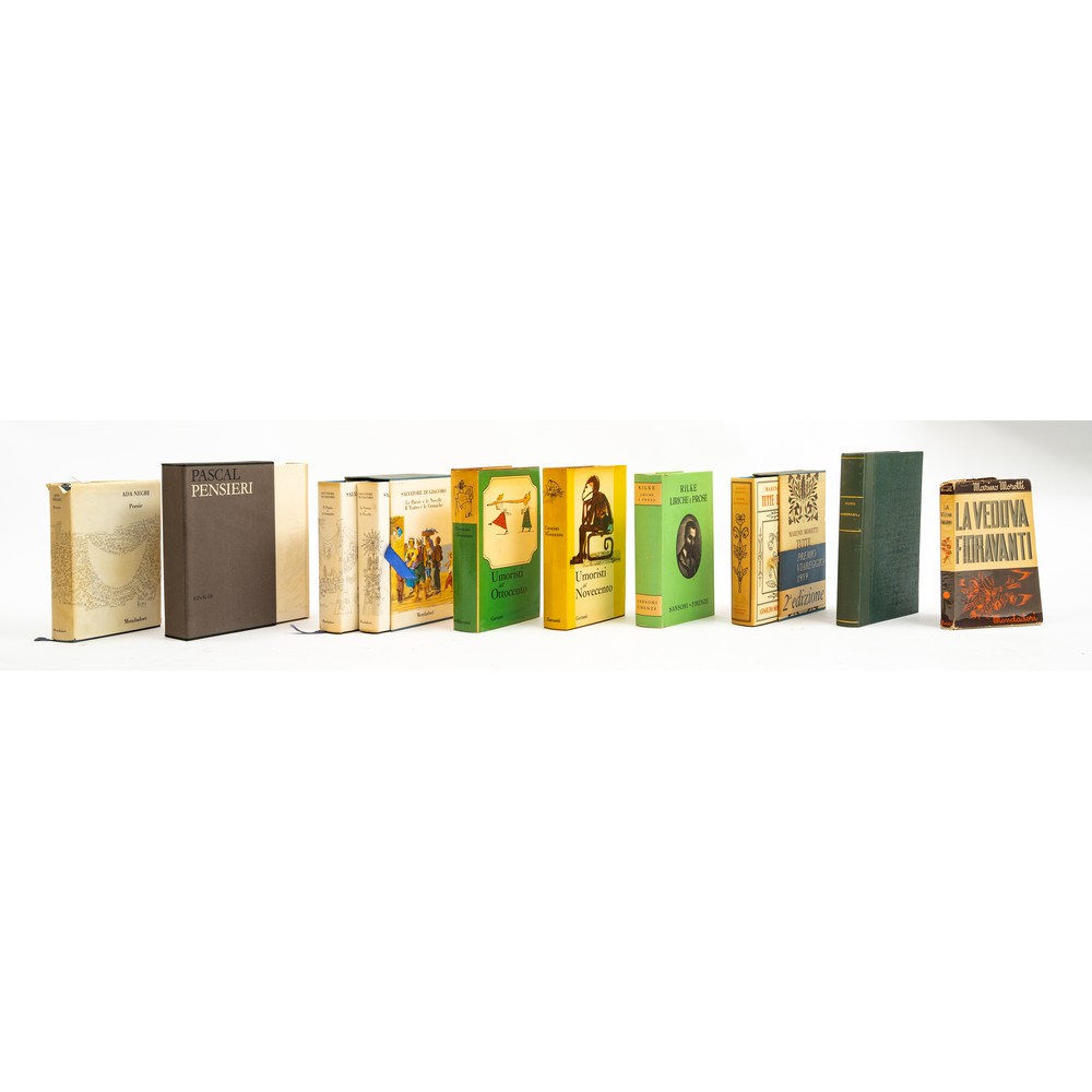 DIECI VOLUMI DI VARIA: 1) Blaise Pascal PENSIERI, ed. Giulio Einaudi 1962. Volume in cofanetto editoriale. In 8°. Legatura editoriale rigida telata con acetato protettivo. In perfette condizioni. Pp. XLVI, 478. 2) Rainer Maria Rilke LIRICHE E POESIE, ed. Sansoni, 1951. Legatura editoriale rigida telata con titoli dorati al piatto e al dorso. Sopraccoperta in carta figurata. Pp. XX, 957.3) Salvatore Di Giacomo LE POESIE E LE NOVELLE. IL TEATRO E LE CRONACHE, ed. Mondadori 1967. 2 volumi in 8°, in cofanetto editoriale illustrato. Testo stampato su carta velina. Legature editoriali in piena tela con titoli dorati ai dorsi e sopraccoperte editoriali. In perfette condizioni. Pp. 917; 1004. 4) Ada Negri POESIE, ed. Mondadori, 1966. In 8°. Testo stampato su carta velina. Legatura editoriale in piena tela con titoli dorati al dorso e sopraccoperta editoriale. In ottime condizioni. Pp. 1015.5) Marino Moretti TUTTE LE NOVELLE, ed. Arnoldo Mondadori 1959. In 8°. Testo stampato su carta velina. Legatura editoriale in piena tela con titoli dorati al dorso e sopraccoperta editoriale. Taglio di testa colorato. In ottime condizioni. Pp. 1022.6) Attilio Bertolucci – prefazione e note introduttive - UMORISTI DELL’OTTOCENTO, ed. Garzanti 1967. In 8°. Legatura editoriale in Balacron con sopraccoperta illustrata. In ottime condizioni. Pp. 664. 7) Attilio Bertolucci – prefazione - UMORISTI DEL NOVECENTO, ed. Garzanti 1967. In 8°. Legatura editoriale in Balacron con sopraccoperta illustrata. In ottime condizioni. Pp. 559.8) Marini Moretti LA VEDOVA FIORAVANTI, ed. Mondadori 1941. In 8° piccolo. Brossura editoriale illustrata con ali. Acetato protettivo. Pp. 307. 9) Victor Hugo I MISERABILI, ed. Società Editoriale Milanese 1907. In 8°. Con moltissime illustrazioni n. t. stampato su due colonne su carta velina. Rilegatura successiva in mezza percallina e piatti cartonati, che conserva la brossura originale. Titoli in oro al dorso. pp. 672.