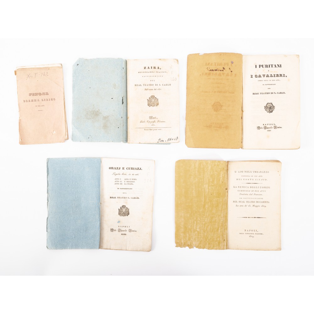 CINQUE LIBRETTI TEATRALI DEL XIX SECOLO: 1) Conte Giraud L’AJO NELL’IMBARAZZO, commedia in tre atti, ed. Napoli Tipografia Flautina 1819. In 16°. Libretto dell’Opera rappresentata al Real Teatro di Caserta il 25 Maggio 1819. Coperta applicata. Pp. 16. 2) ZAIRA MELODRAMMA TRAGICO, ed. Napoli, Tipografia Flautina 1831. In 16°. Libretto dell’Opera rappresentata nel Real Teatro San Carlo nell’Estate del 1831. In brossura editoriale. Pp. 38. In ottime condizioni. 3) FINGAL DRAMMA LIRICO IN TRE ATTI, ed. Palermo, Francesco Abate 1847. Da rappresentarsi nel R. Teatro Carolino per nona opera dell’Anno Teatrale 1846 – 47. In 16°. In brossura editoriale. In ottime condizioni. Pp. 43. 4) ORAZJ E CURIAZJ, TRAGEDIA LIRICA IN TRE ATTI, ed. Napoli Tipografia Flautina, 1846. Da rappresentarsi nel Real Teatro S. Carlo. In brossura editoriale. Pp. 32. 5) I PURITANI E I CAVALIERI, OPERA SERIA IN TRE ATTI, ed. Napoli Tipografia Flautina, 1837. Da rappresentarsi nel Real Teatro di S. Carlo. Con brossura applicata successiva. Pp. 44.