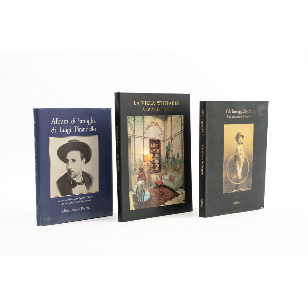 TRE VOLUMI DI VARIA SU SICILIANI ILLUSTRI E SICILIA: 1) Maria Luisa Aguirre d’Amico - a cura di - ALBUM DI FAMIGLIA DI LUIGI PIRANDELLO, ed. Sellerio 1979. Con una nota introduttiva di Leonardo Sciascia. Collana La Cuba n. 2. Legatura editoriale in tela con sopraccoperta illustrata. In buone condizioni. Cm 28 x 22. Pp. 164.2) Michele Di Dio / Erminia Scaglia GLI INTERGUGLIELMI. UNA DINASTIA DI FOTOGRAFI, ed. Sellerio 2003. CATALOGO DELLA MOSTRA TENUTASI AL Loggiato di San Bartolomeo dal 7 Febbraio al 9 Marzo 2003. Collana L’occhio di vetro n. 1. Brossura editoriale illustrata. Pp. 287.3) Romualdo Giuffrida / Rosario Chiovaro LA VILLA WHITAKER A MALFITANO, ed. Accademia Nazionale di Scienze Lettere e Arti, Palermo 1986. Legatura editoriale in Balacron con fotoapplicazione al piatto. Alcune fioriture alle ultime pagine. Pp. 137 con 8 tavole più volte ripiegate f. t.