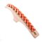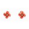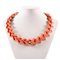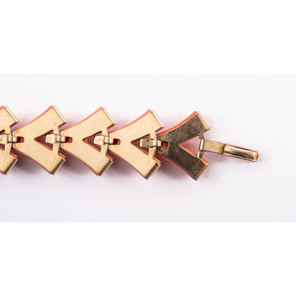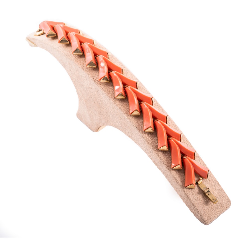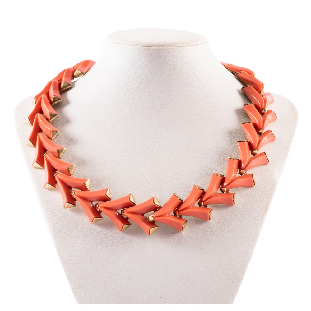 Parure “Valencia” in metallo dorato e applicazioni a forma di “V” in materiale plastico color corallo, composta da collier, bracciale ed orecchini. Marchio di produzione.