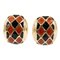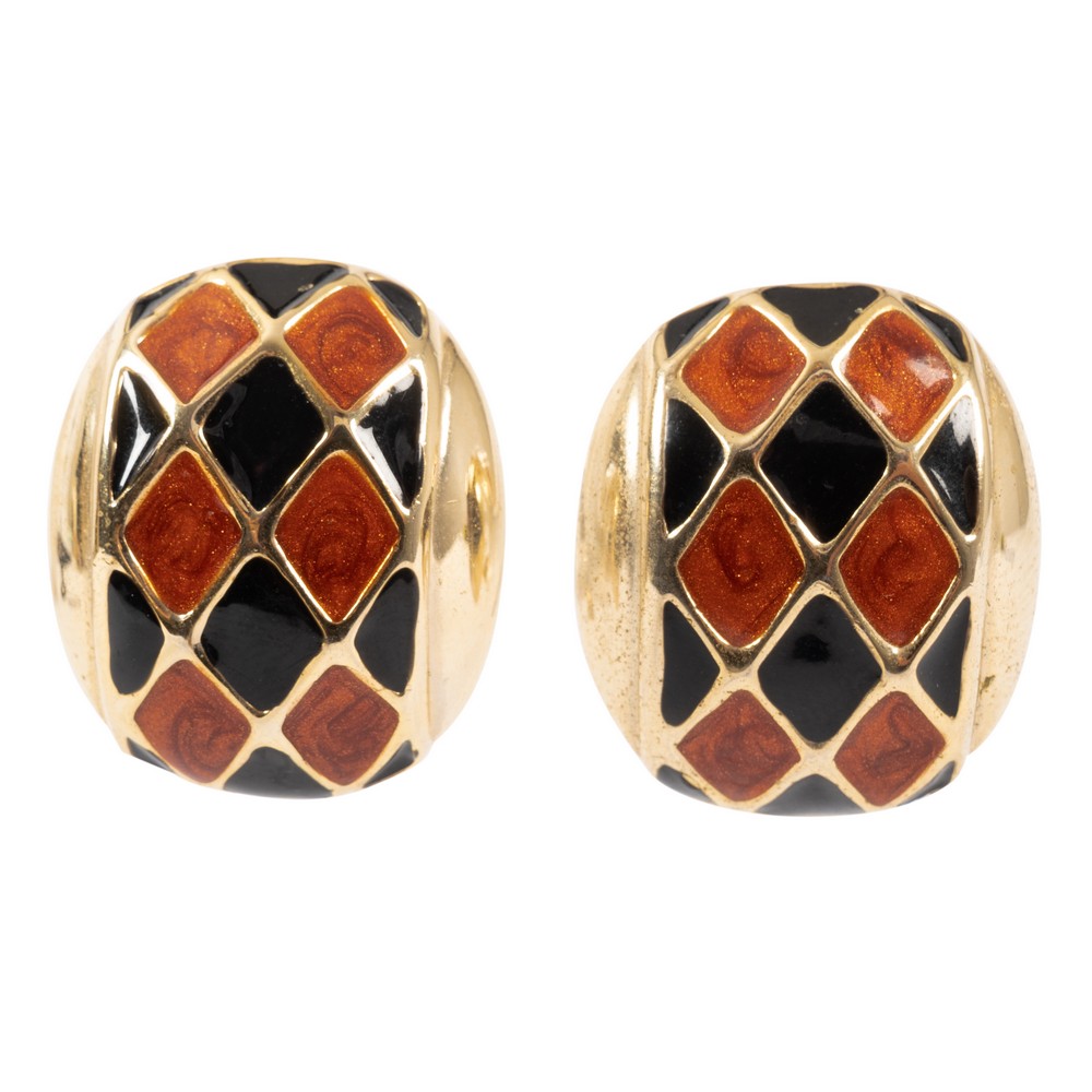 Orecchini a clips in metallo dorato con centrale in smalto a rombi marrone e nero.