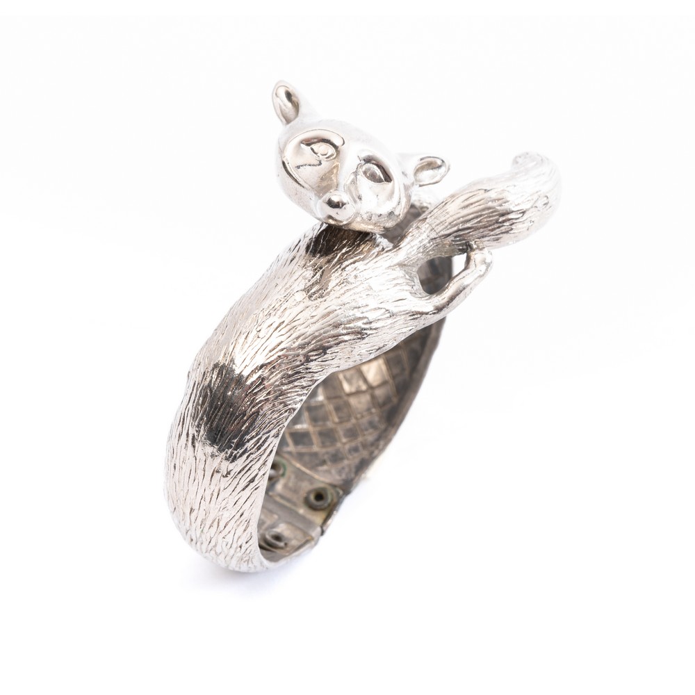 Bracciale contrarie a molla raffigurante una volpe in metallo argentato.