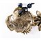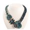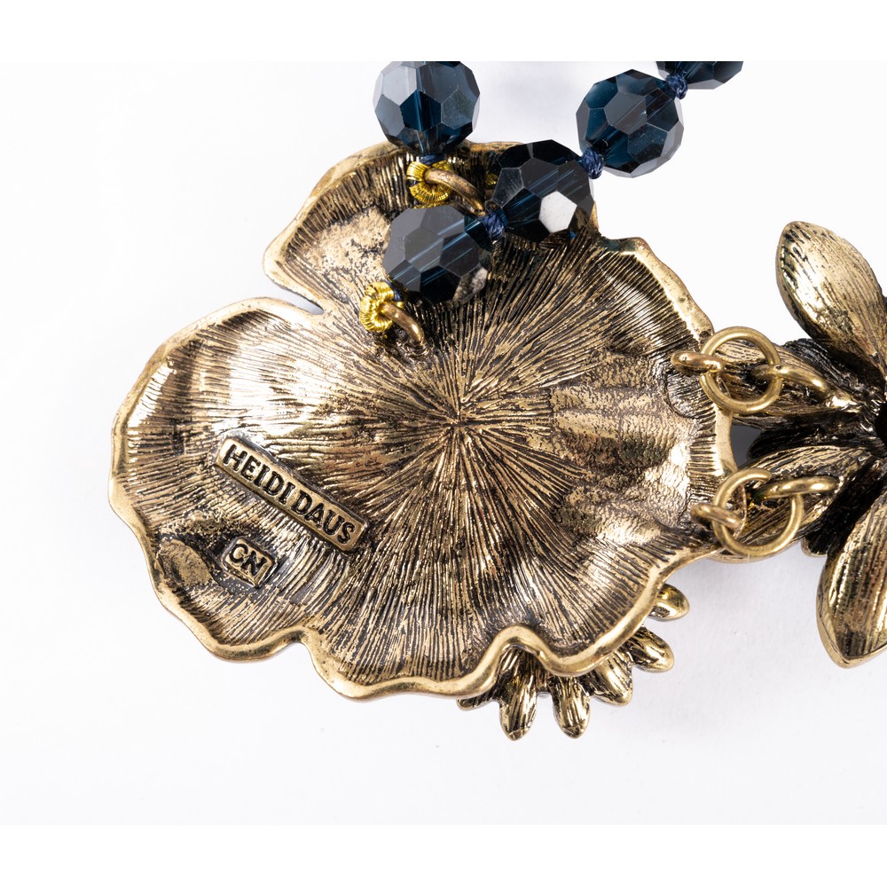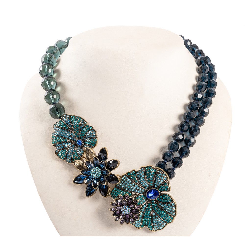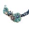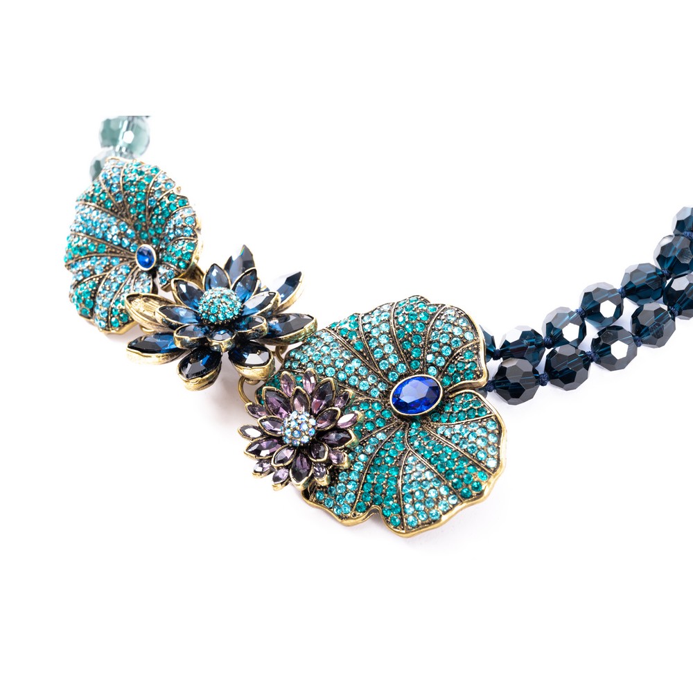 Collana a sfere sfaccettate grigie e blu, centrale in ottone dorato con grandi foglie e fiori in cristallo Swarovski colore blu, celeste e viola. Marchio di produzione.