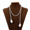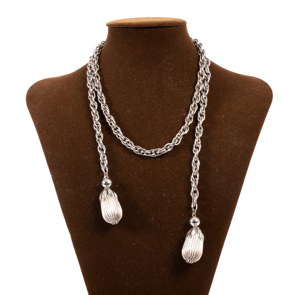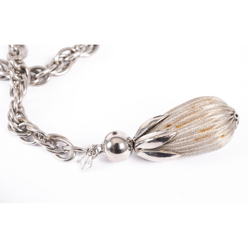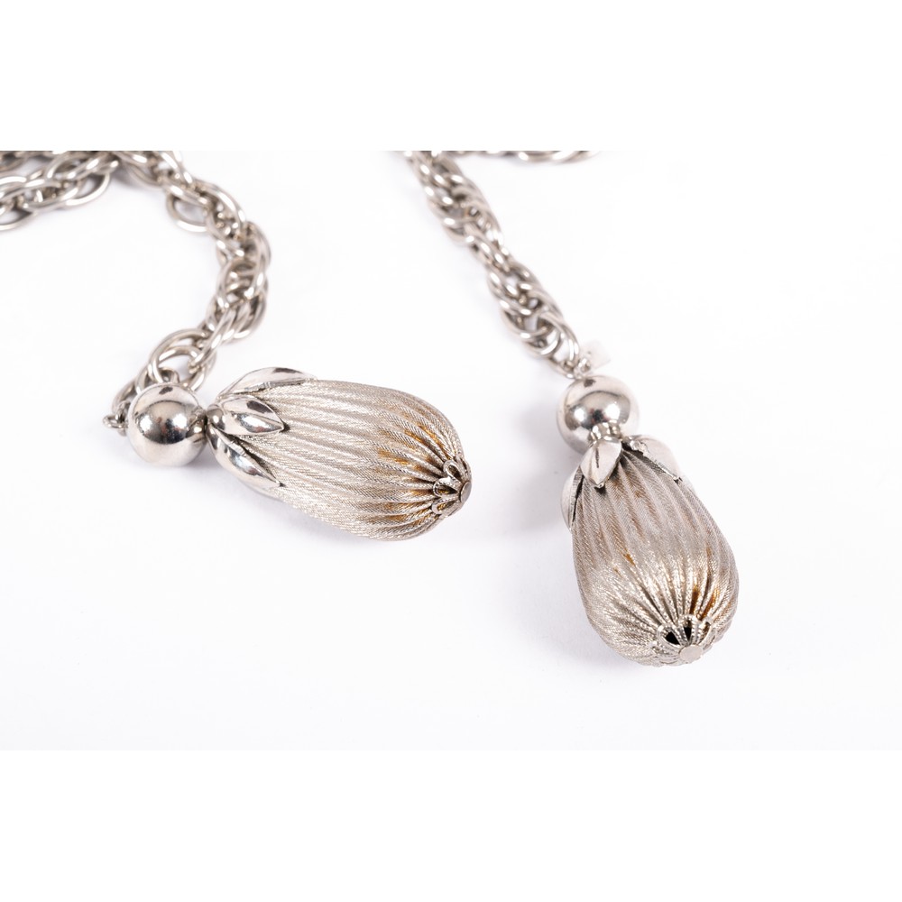 Collana a laccio in metallo argentato, maglia a catena con finali a ghianda. Marchio di produzione.