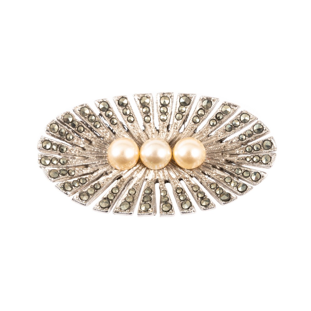 Spilla ovale in metallo argentato con tre perle centrali e strass bianchi.