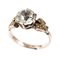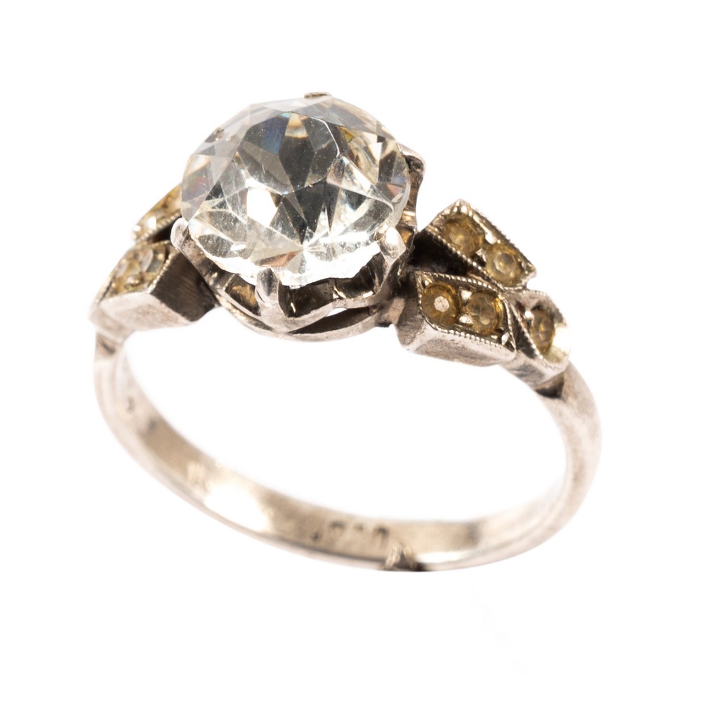 Anello in metallo argentato con solitario di strass bianco.