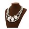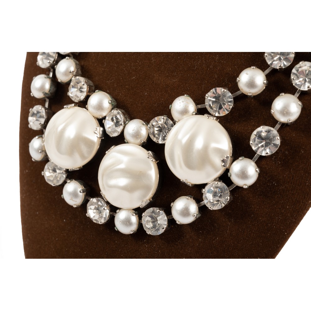Grande collana in metallo argentato con tre pastiglie in perla contornate da due fili con strass e mezze perle.