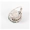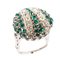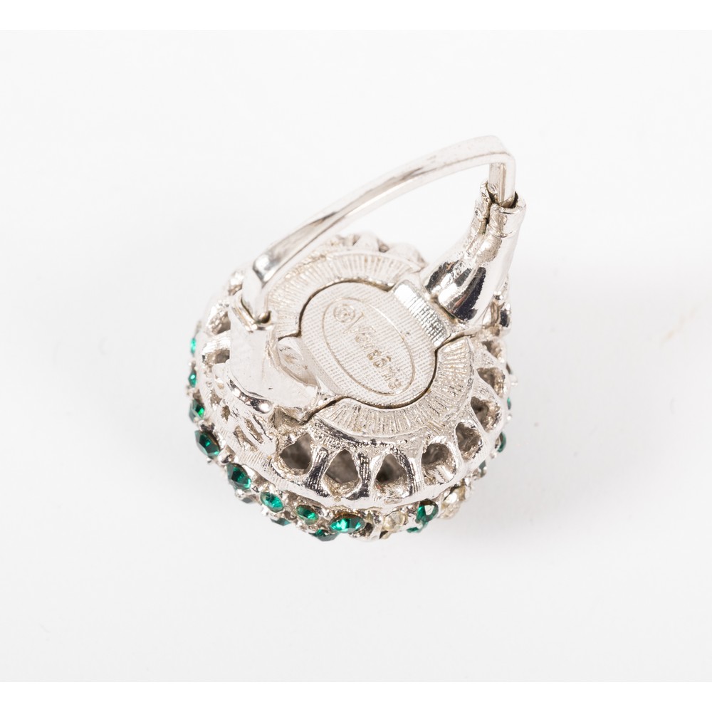 Anello con pavè di cristalli color verde smeraldo e bianchi, montatura in metallo argentato. Marchio di produzione.