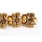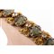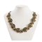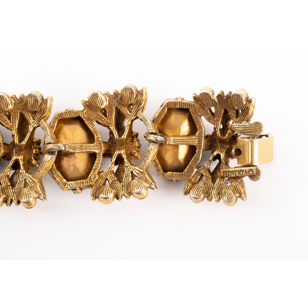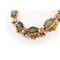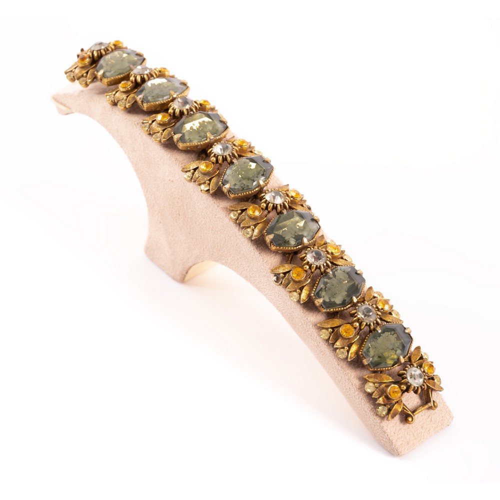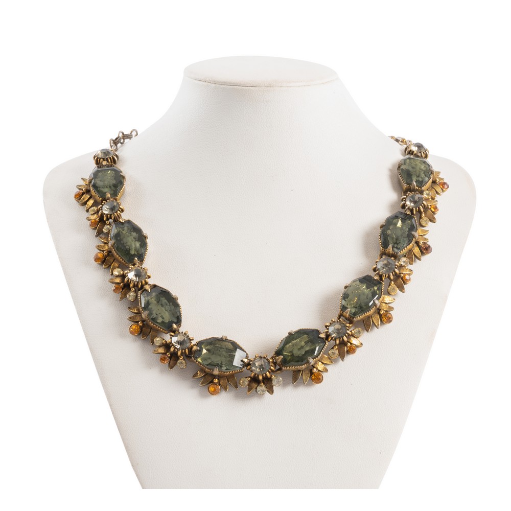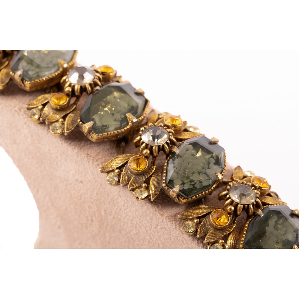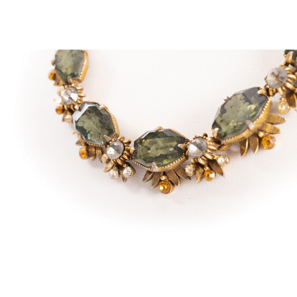 Parure composta da collier e bracciale in metallo dorato con grosse losanghe in strass verde, ambra e bianchi. Marchio di produzione.