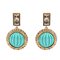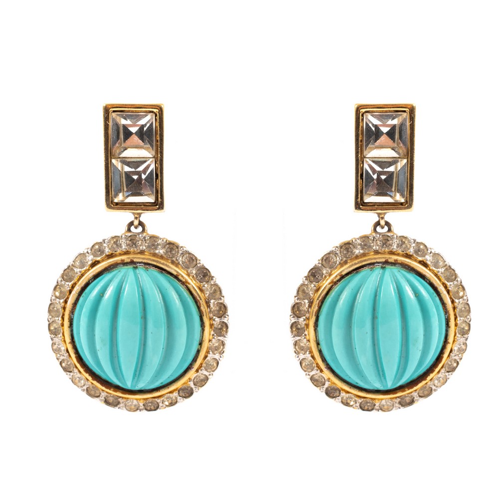 Orecchini a clips con montatura in metallo dorato, due zirconi quadrati da cui pendono pastiglie baccellate color turchese contornate da zirconi. Marchio di produzione.