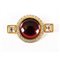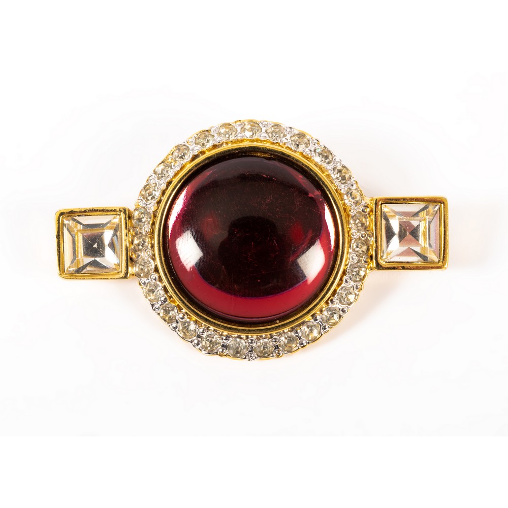 Spilla con montatura in metallo dorato, due zirconi quadrati con al centro una pastiglia circolare in pasta vitrea color rosa violaceo e contornata da zirconi. Marchio di produzione.