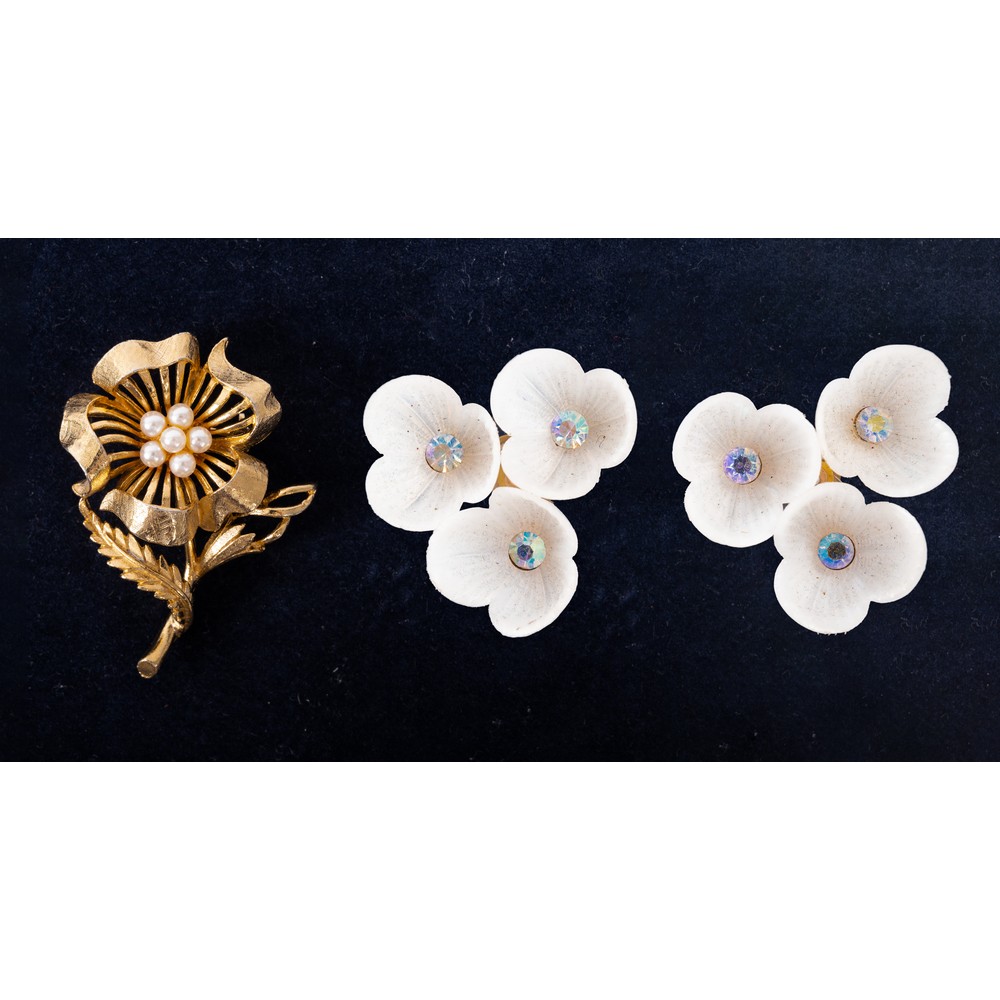 Orecchini a clips con tre fiori a campanula in plastica e strass centrale.