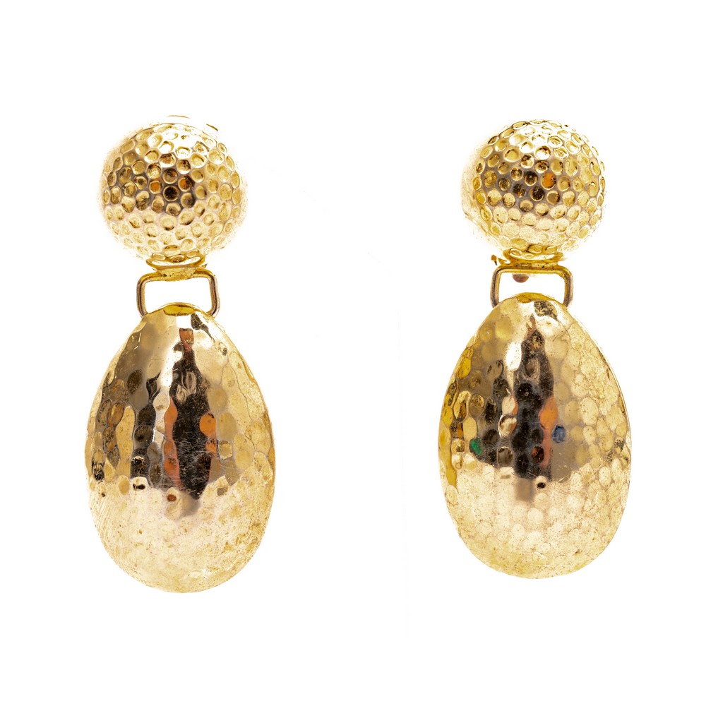 Orecchini a clips in metallo martellato dorato con goccia basculante.