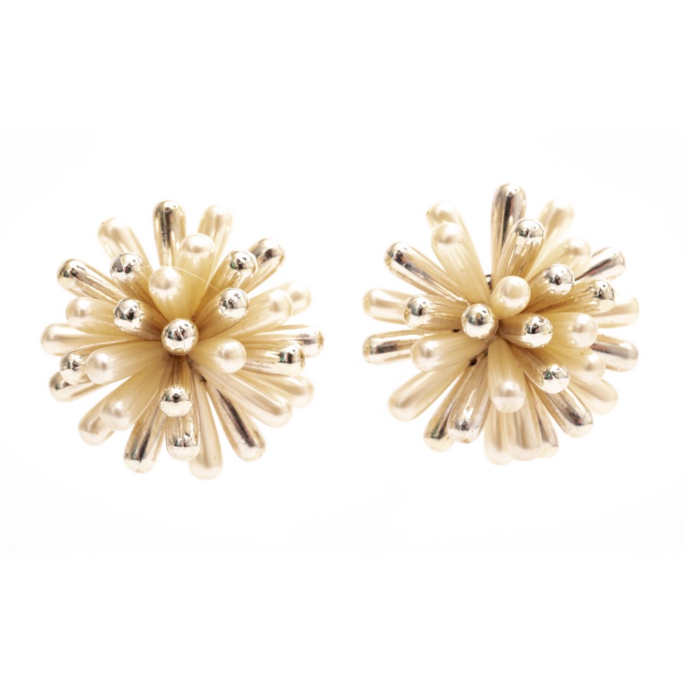Orecchini a clips, modello a riccio con elementi in metallo dorato e madreperlato.