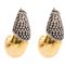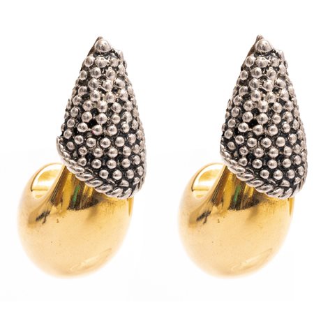 Grande paio di orecchini a clips in metallo dorato con parte superiore a microsfere in metallo argentato.