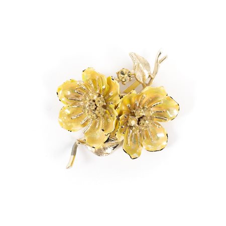 Grande spilla floreale in metallo dorato e smaltato giallo, pistilli in strass citrini. Marchio di produzione. Misure: cm 6 x 5,5.