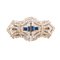 Spilla “Duette” in metallo argentato, strass bianchi e color zaffiro. Sagoma a losanga con decori geometrici. Marchio di produzione incusso e numero seriale di produzione.
