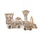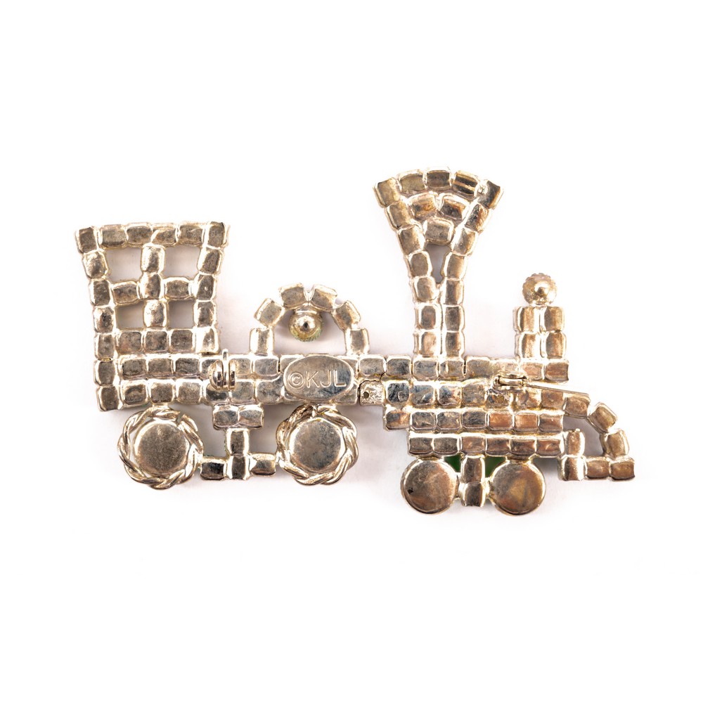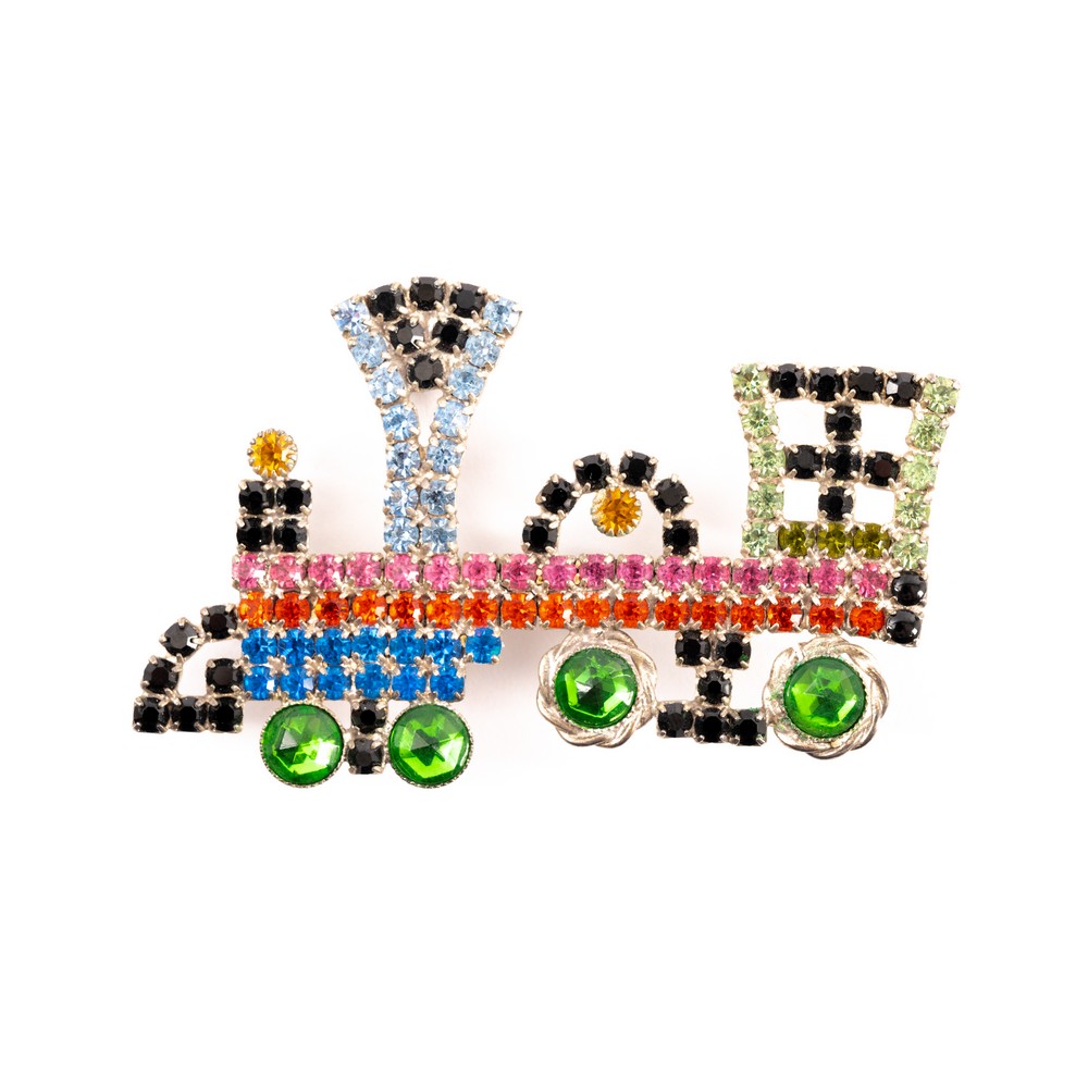 Spilla locomotiva in metallo argentato con strass multicolori. Marchio di produzione.