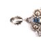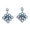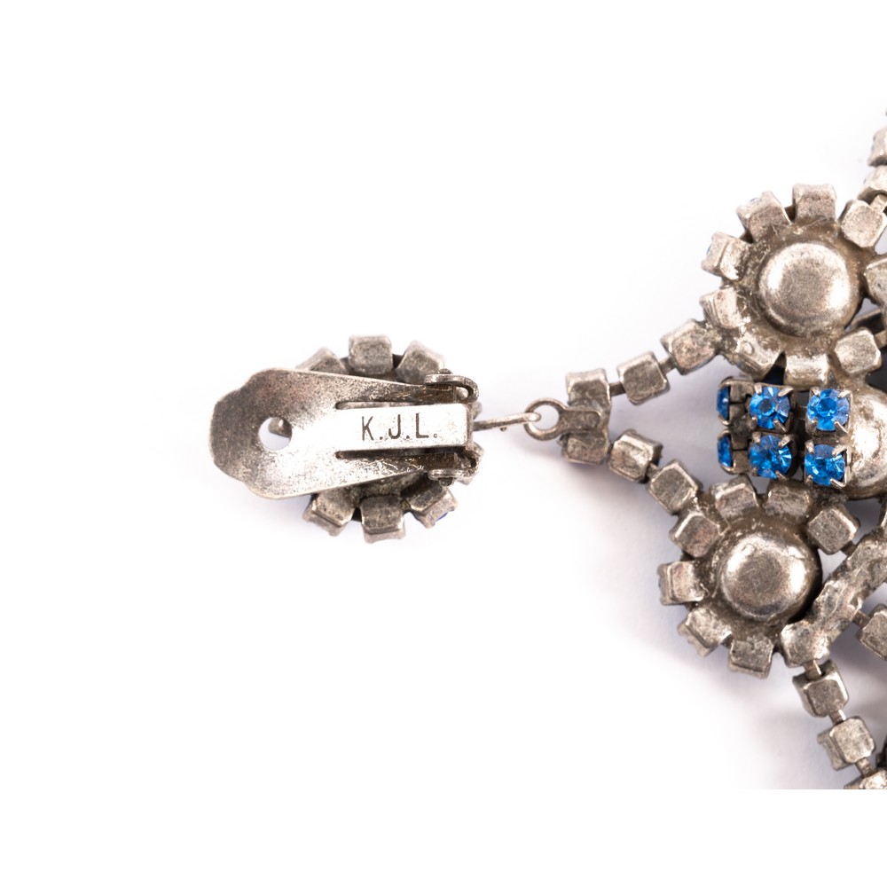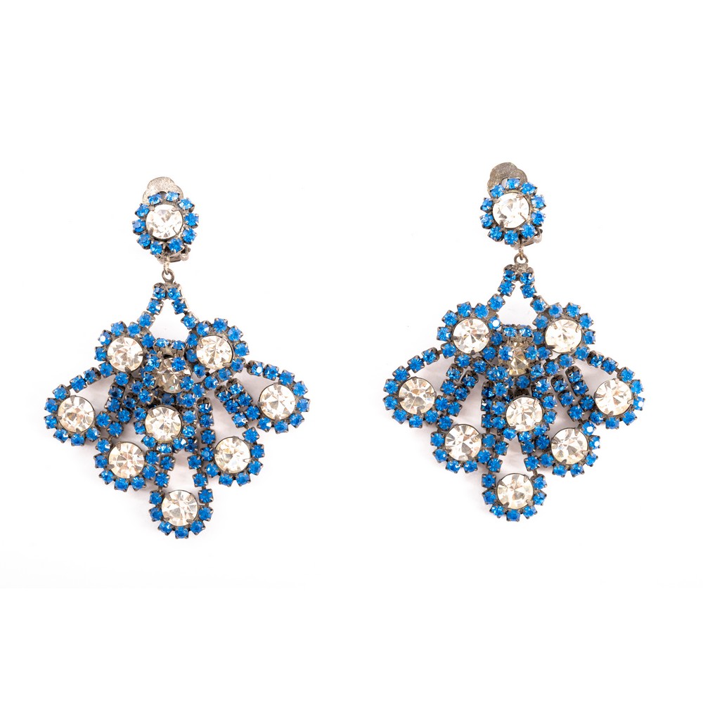 Grandi orecchini pendenti a clips in metallo argentato con cristalli blu e bianchi.