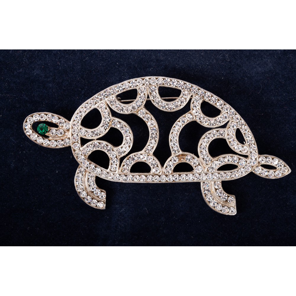 Spilla in metallo argentato raffigurante una tartaruga in strass bianchi con occhio in strass verde. Mancanze.