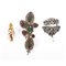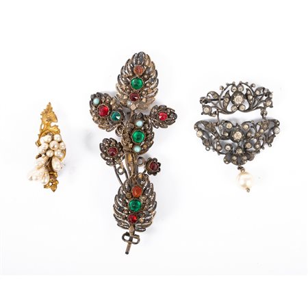 Spilla in metallo dorato con grappolo di perle a goccia.