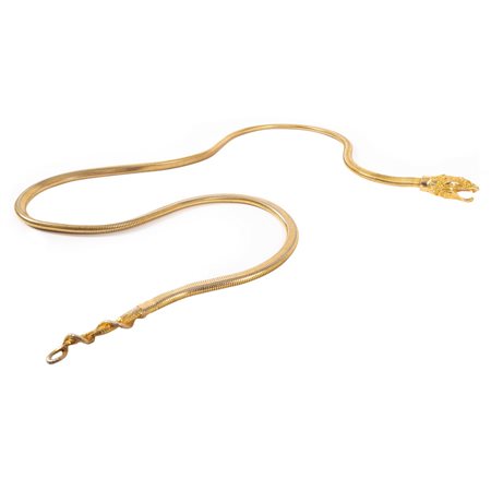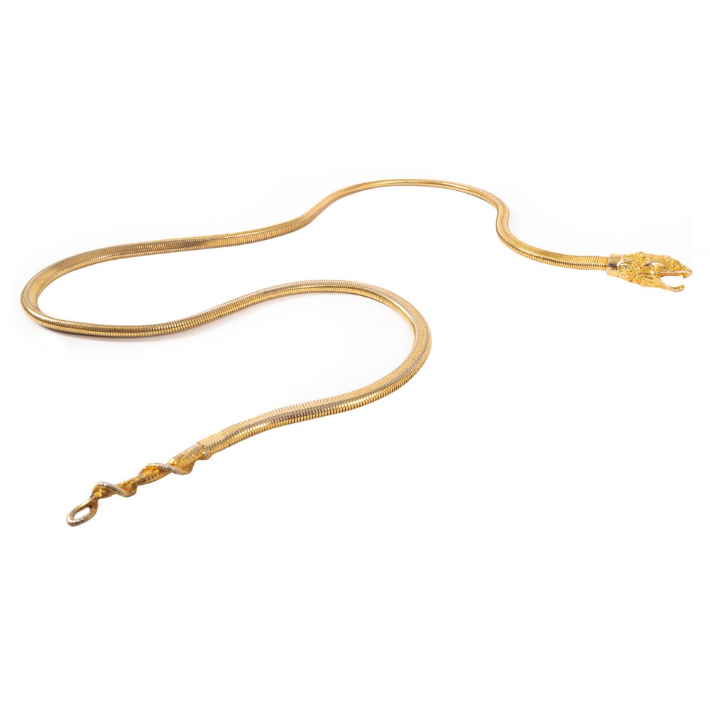 Cintura tubogas in metallo dorato con fibbia a molla a testa di serpente.