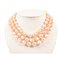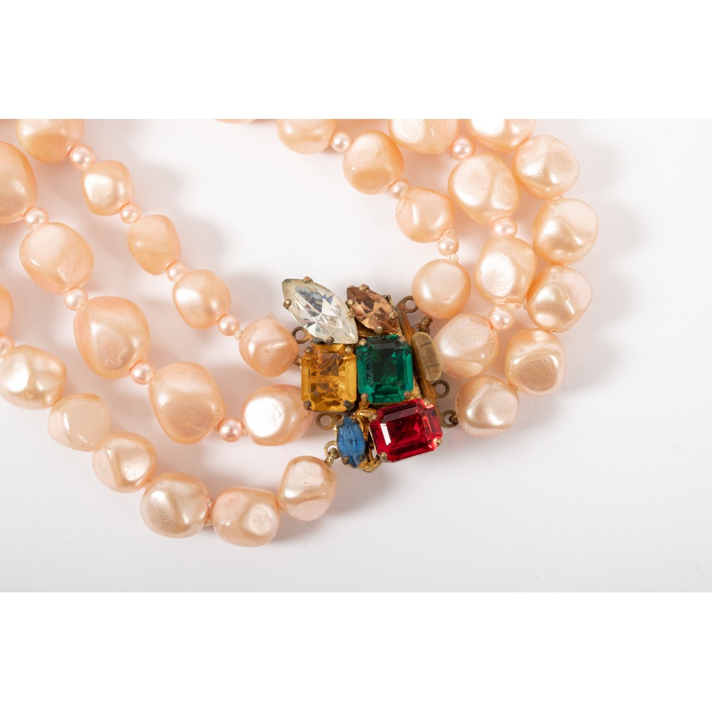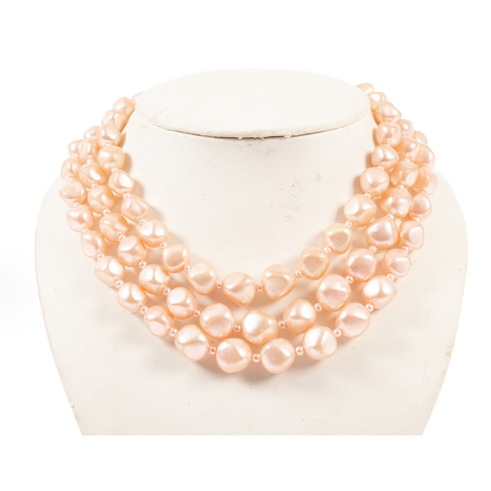 Collana a tre fili in perle di plastica rosata, susta con strass multicolor. Marchio GM.