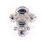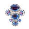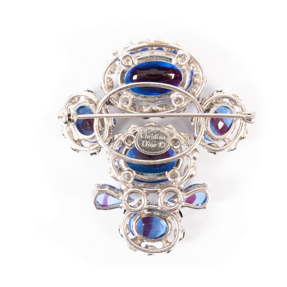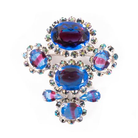 Rara spilla in metallo argentato con cristalli blu listati in color rubino e strass opalescenti. Marchio di produzione.