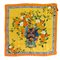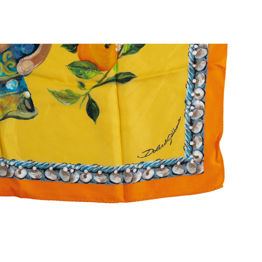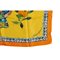 Foulard in pura seta decorato con vaso a forma di testa di moro centrale, tralci di zagara e mandarini. Fondo giallo e bordo arancione. Etichetta di produzione.