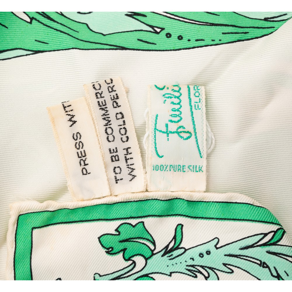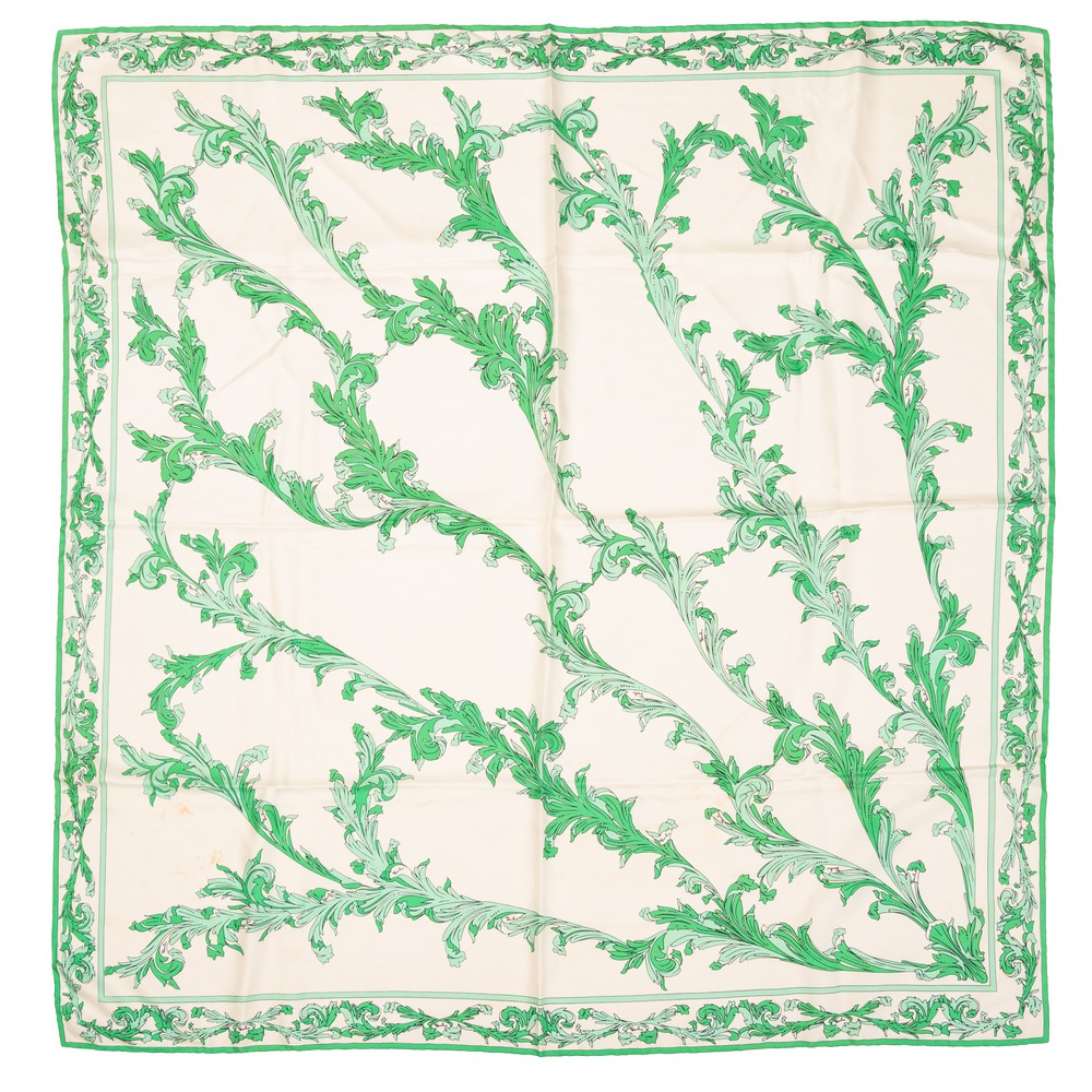 Foulard in pura seta a fondo bianco con tralci verdi. Lievi macchie. Marchio ed etichetta di produzione. Misura 90x90 cm.