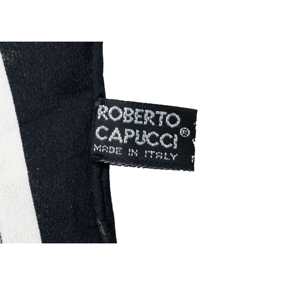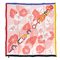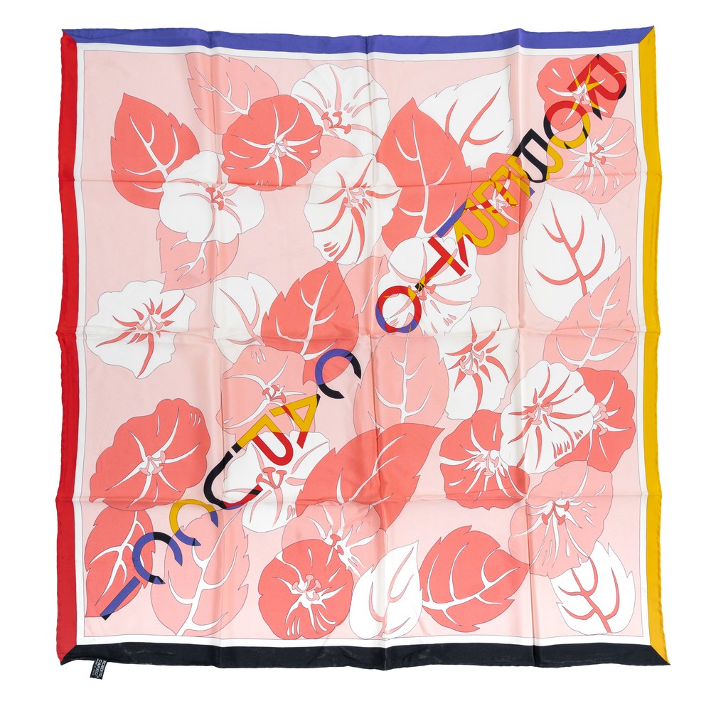 Foulard in pura seta, fondo rosa, disegno a foglie e fiori bianchi e rosa, bordo multicolor. Etichetta di produzione. Dimensioni: cm 82 x 82.