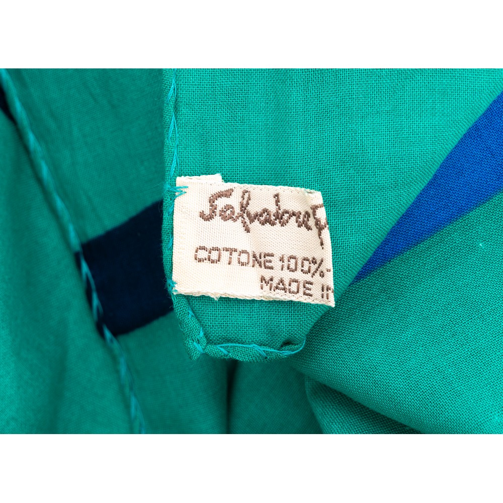 Pareo in cotone con barche su sfondo a righe verdi e bianche. Firma in basso.