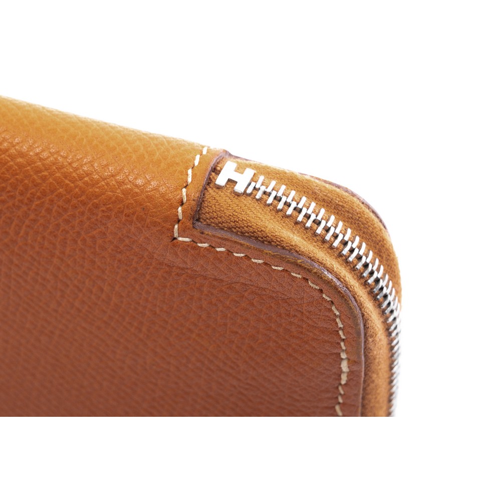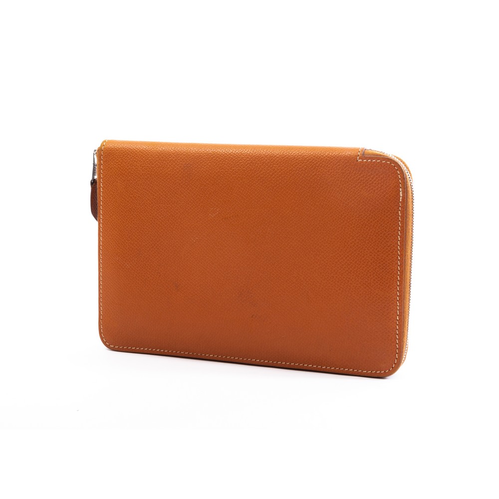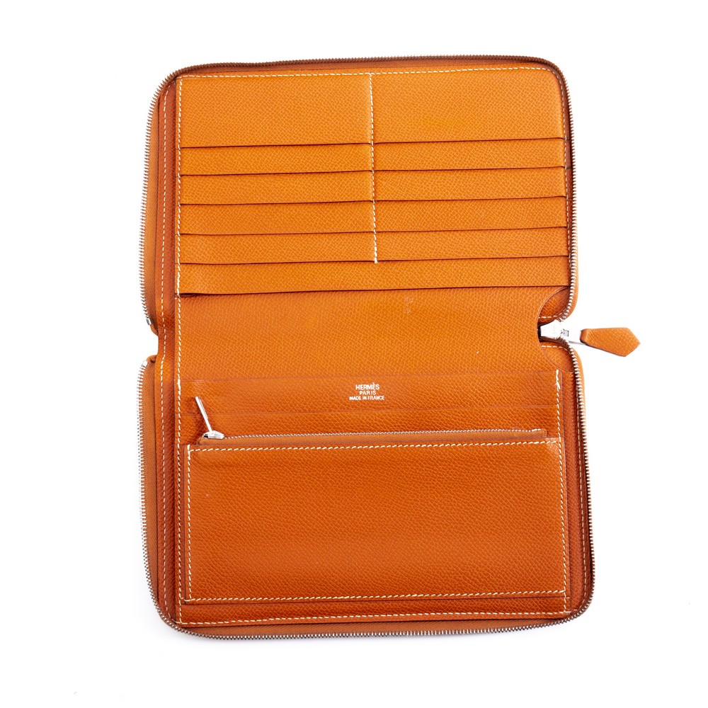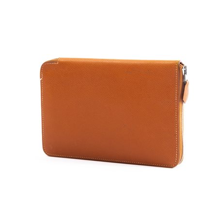 Portafoglio lungo in pelle cognac, chiusura laterale con cerniera, scomparti interni con cerniera e busta. Lievi graffi. Marchio di produzione. Misura:13x19x2cm.