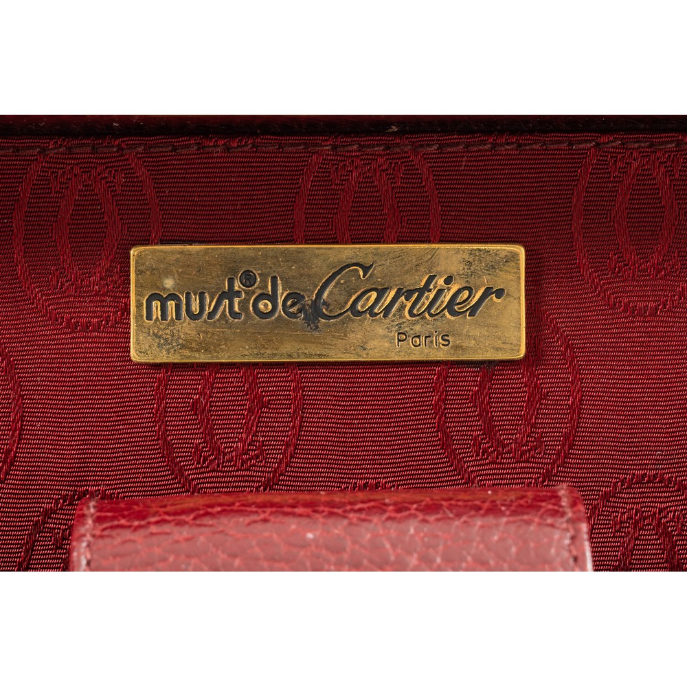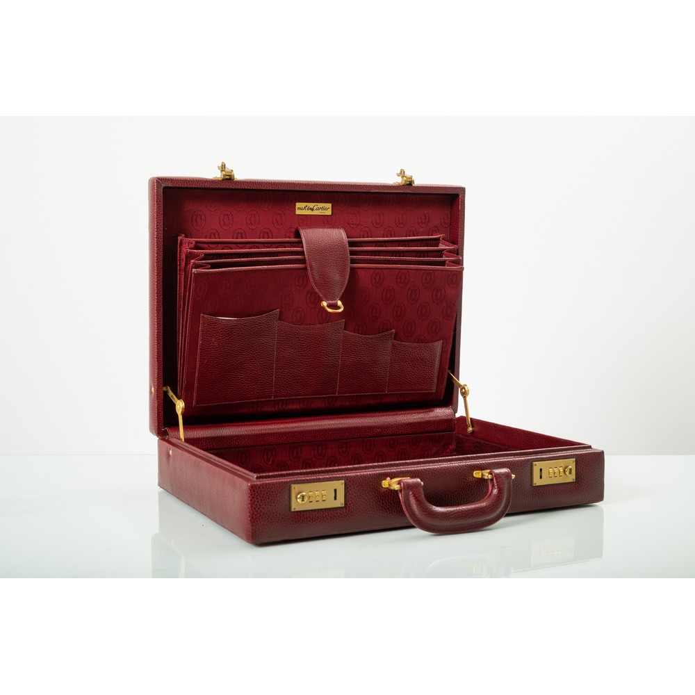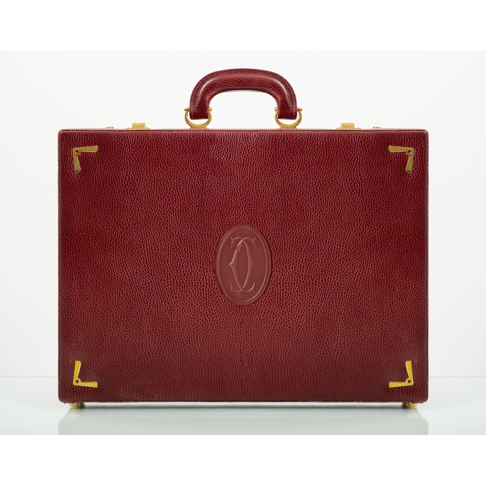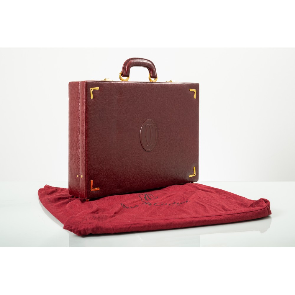 Cartella ventiquattro ore “Must de Cartier” in pelle martellata bordeaux, apertura a scatto con codice numerico, minuterie in ottone. Marchio impresso. Dust bag. Misura 45x38x09.