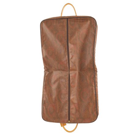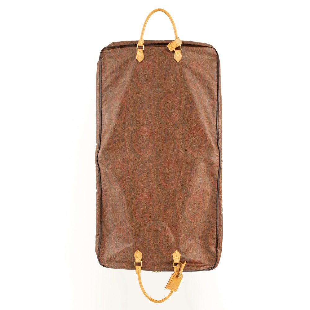 Porta abiti in pelle fantasia paisley, due manici in cuoio e chiusura con cerniera centrale. Minuterie dorate. Etichetta di produzione. Misure cm 57 x 108.