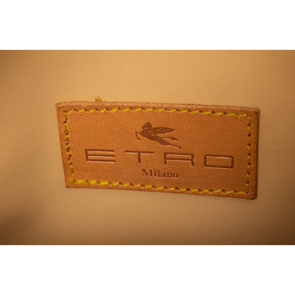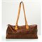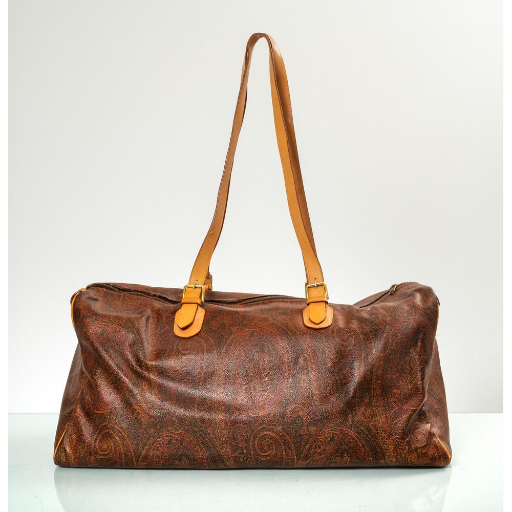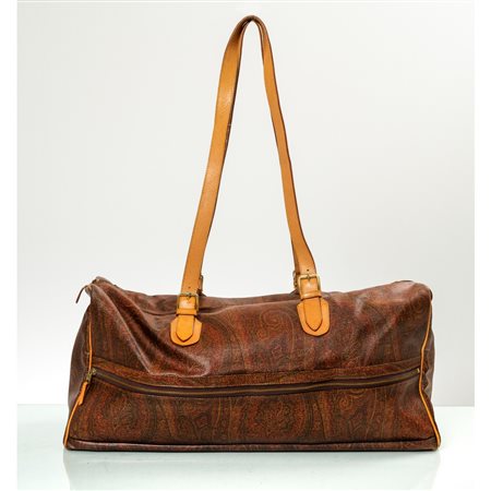 Borsone in pelle, fantasia paisley con manici lunghi in cuoio e interno in tela, chiusura con cerniera e minuterie dorate. Etichetta di produzione. Misure cm 58 x 25 x alt 27.