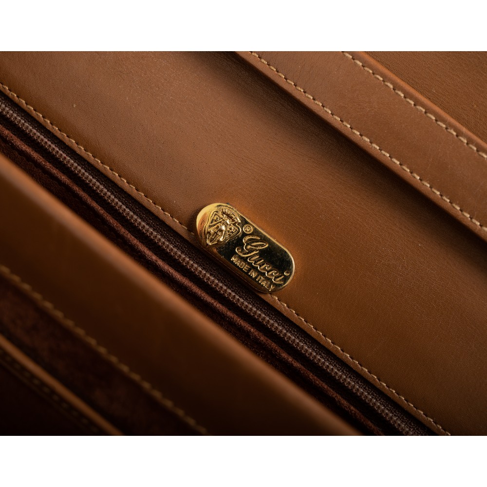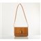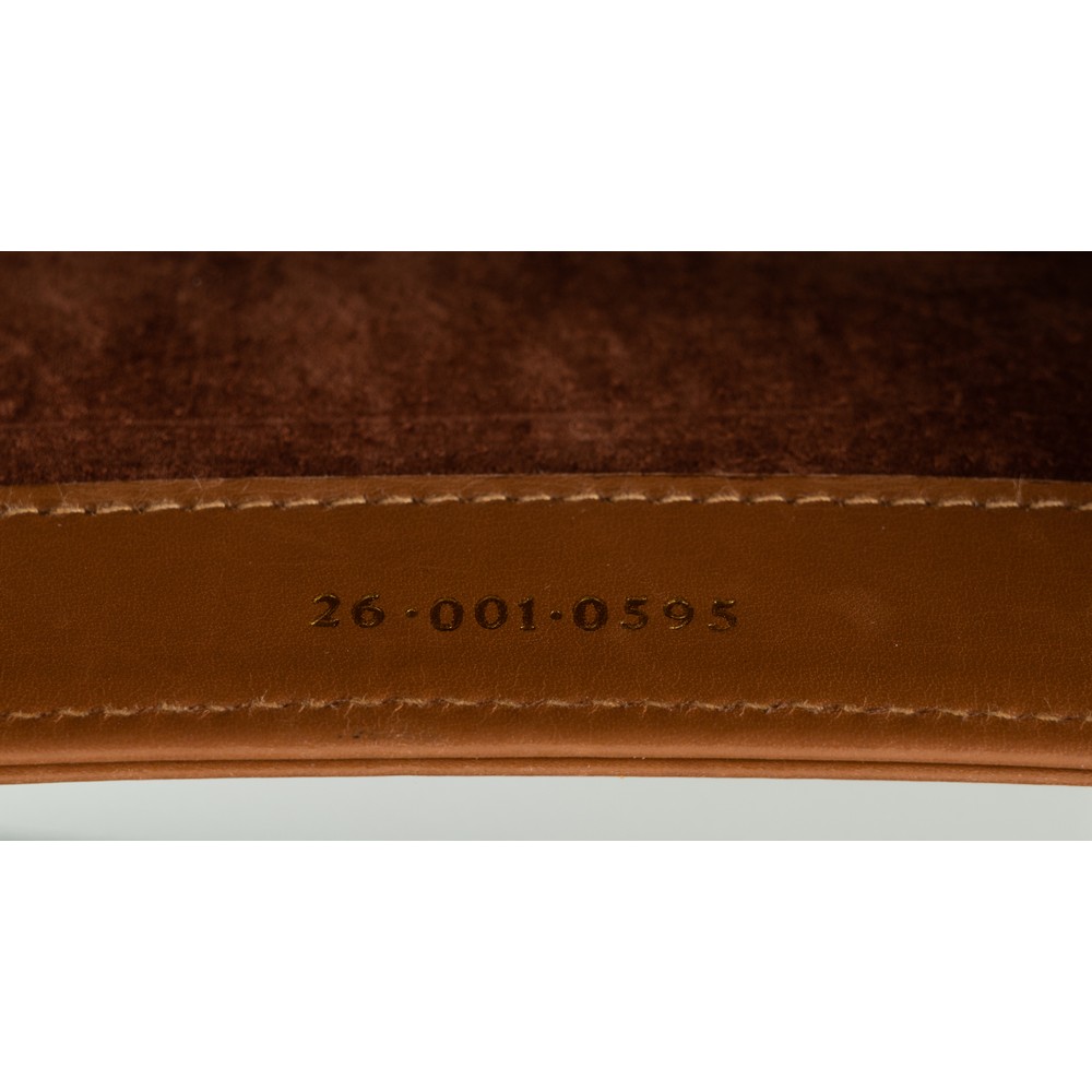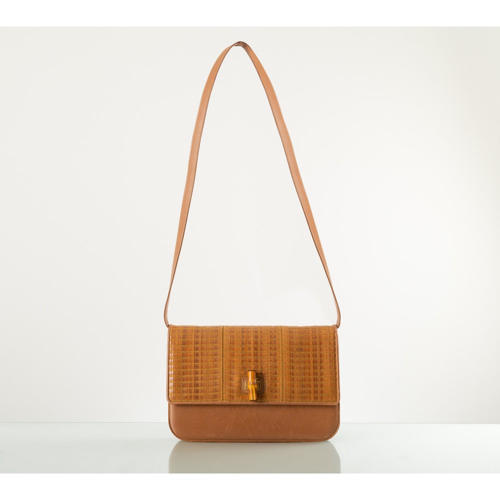 Borsa a tracolla in pelle liscia marrone con intreccio in fibra naturale sulla parte frontale, chiusura in bamboo, con minuteria in metallo cromato e logato. Marchio di produzione inciso su placca in ottone e numero 26 001 0595. Lievi graffi e piccolo segno di biro. Misura 28x20x05 cm.
