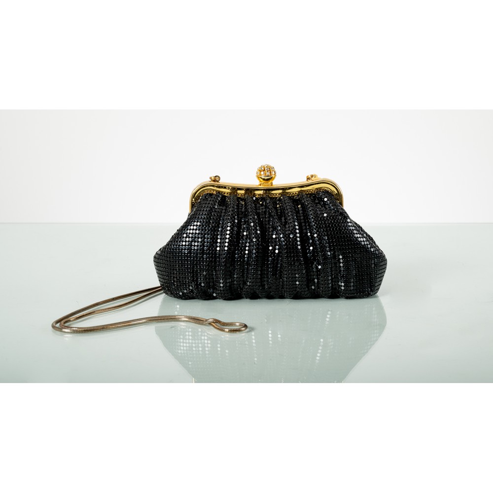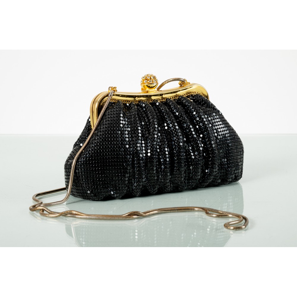 Borsa da sera in maglia metallica nera, struttura in metallo dorato, chiusura gioiello con sfera di strass, catena dorata. Misura 11x18 cm.