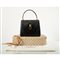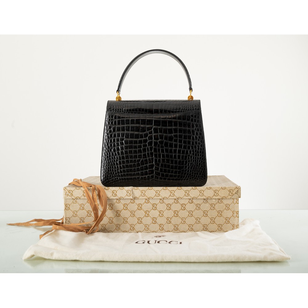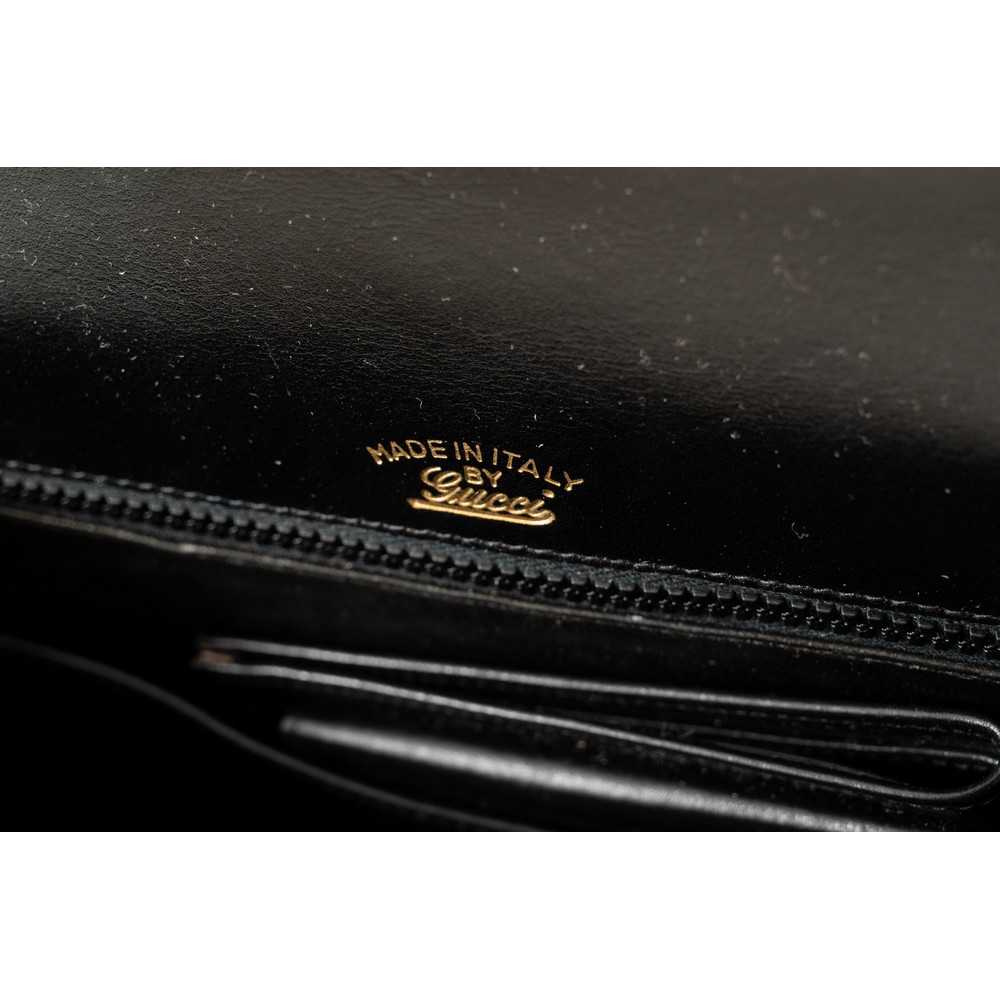 Importante borsa a mano in pelle nera con chiusura in metallo dorato con smalti rossi e verdi, manico in pelle. Dust bag e scatolo originale. Condizioni pari al nuovo. Marchio di produzione.