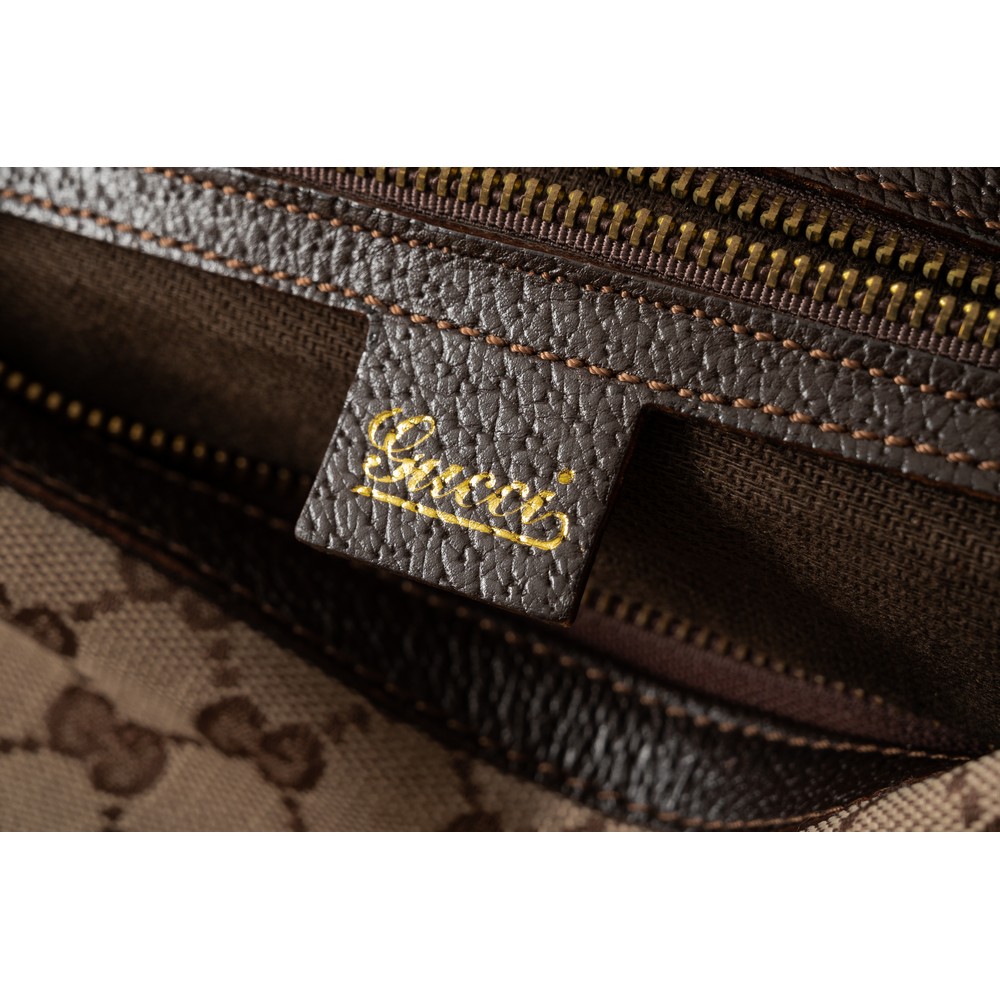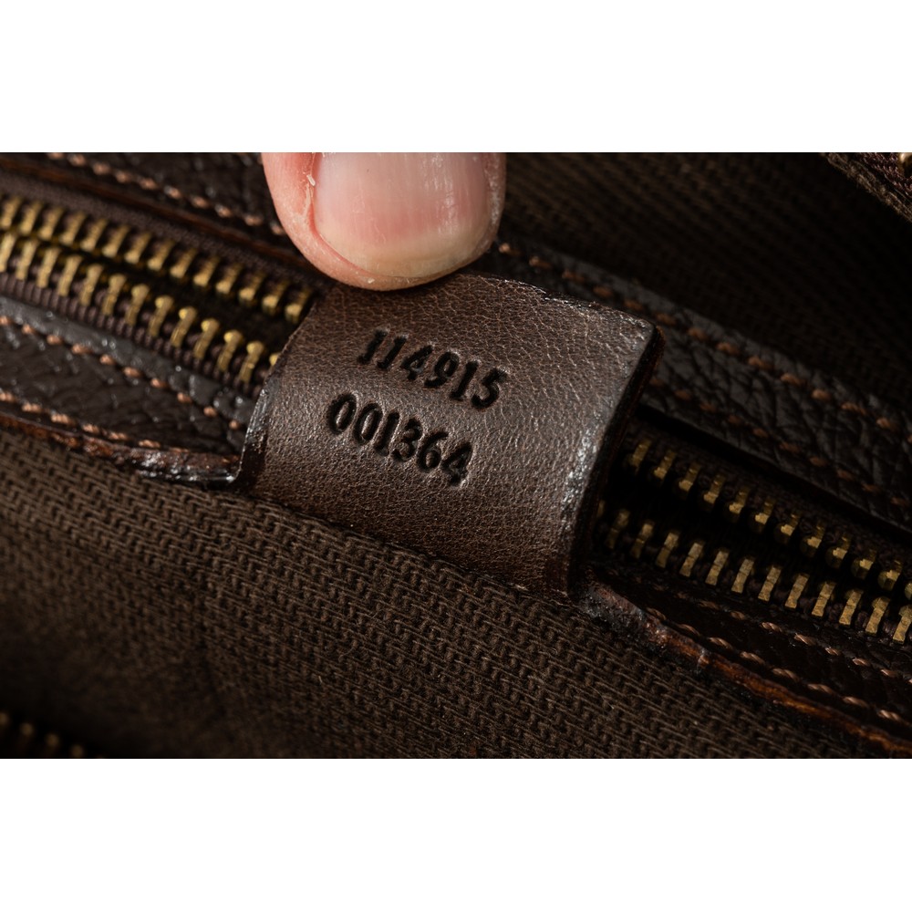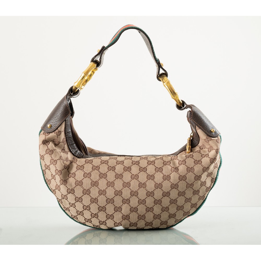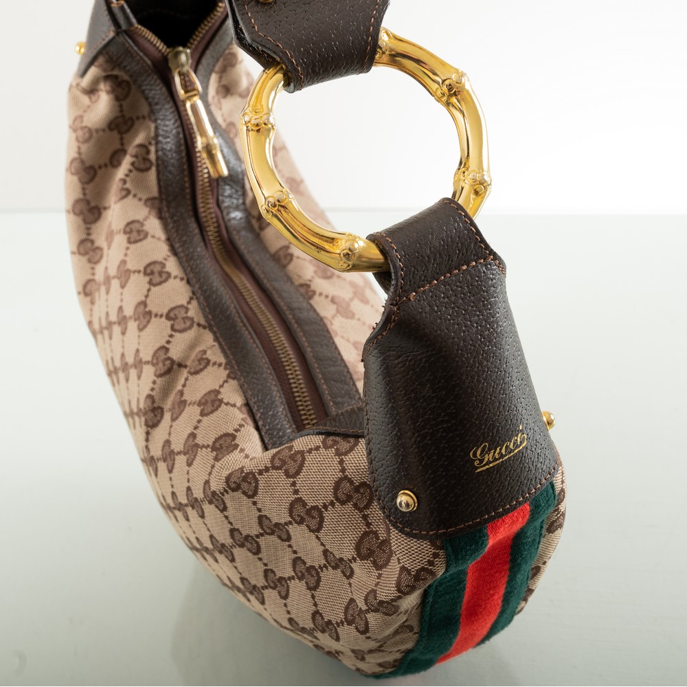 Borsa in tela monogram GG con rifiniture in pelle marrone e anello in bamboo dorato, fascia intessuto bicolore verde e rosso. Firma dorata sulla pelle marrone. Internamente marchio di produzione e numerazione 114915 001364. Misura 33x14x44 cm.