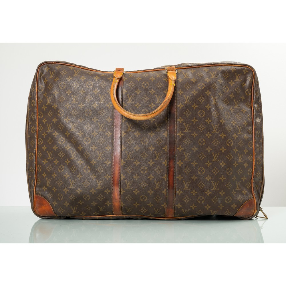 Valigia modello Sirius, in tela monogramma e pelle naturale. Finiture in metallo dorato e doppia maniglia. Interno in tela beige, con tasca placcata e due cinghie elastiche. Stato vintage. Marchio di produzione. Misura: 79x46x23 cm.