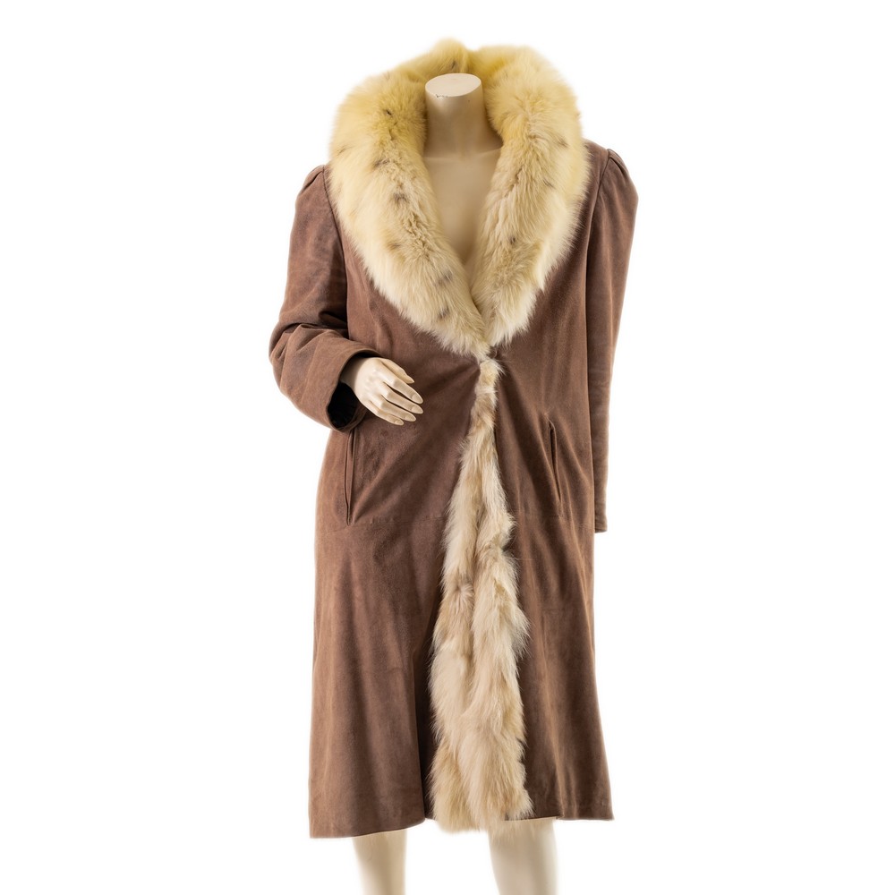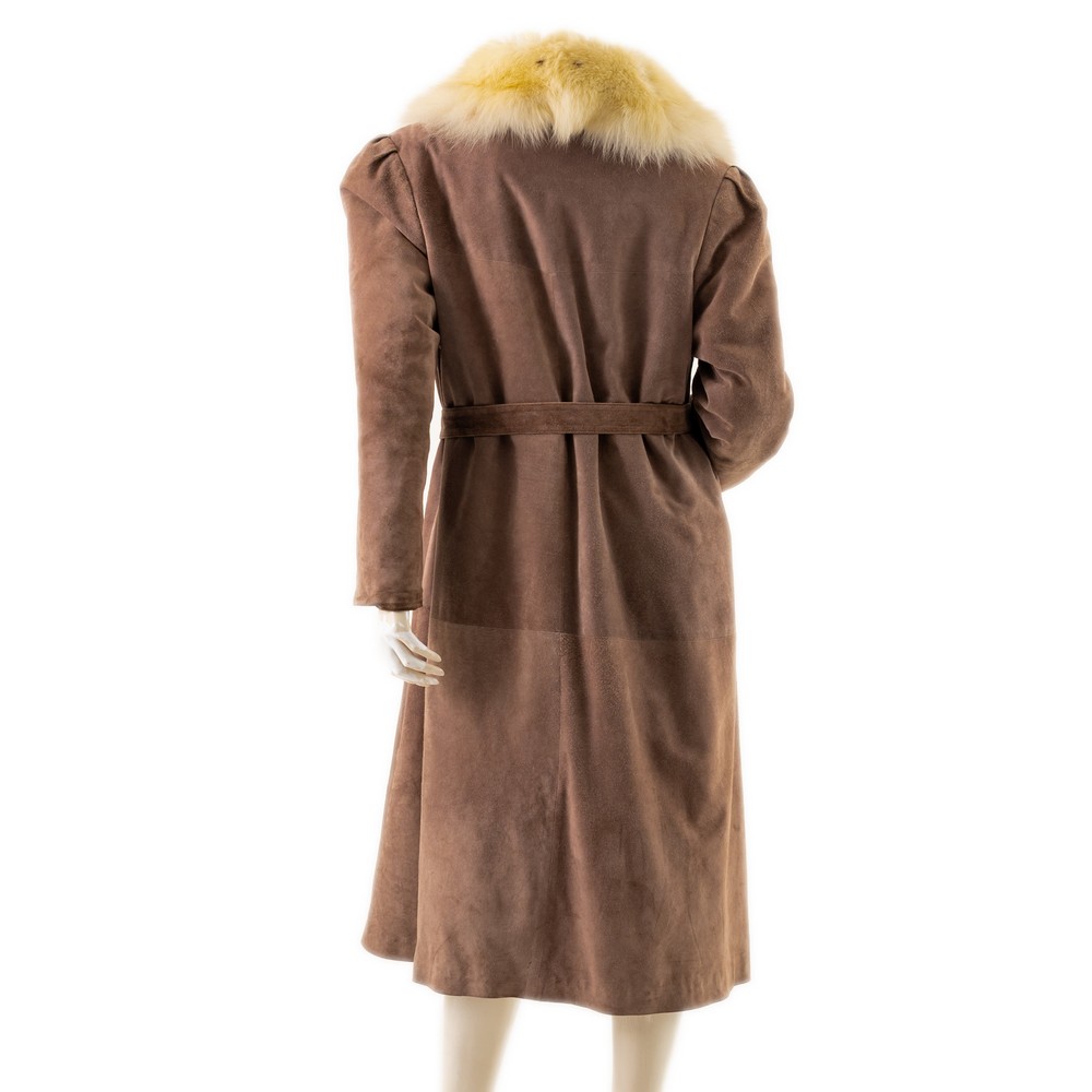Cappotto in pelle di camoscio marrone con interno in pelliccia di lince lontrata, ampio collo. Taglia M.