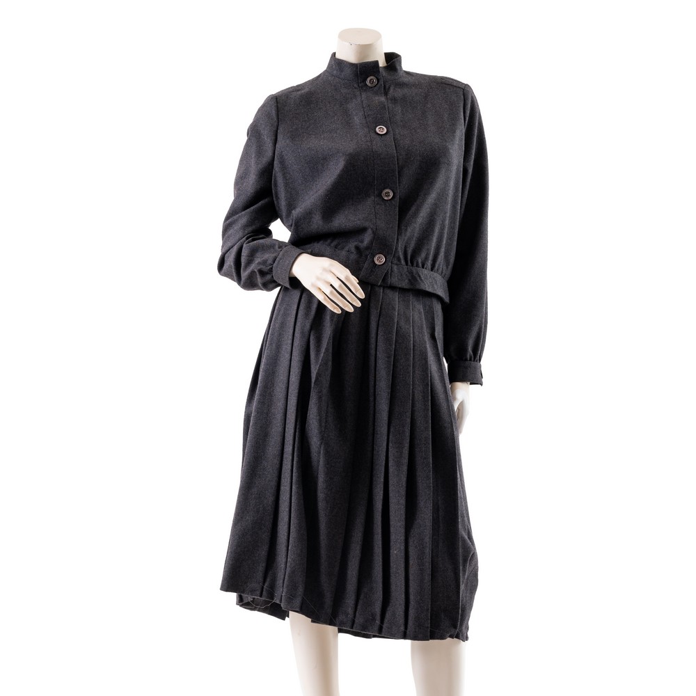 Completato in pura lana color grigio, giacca con abbottonatura anteriore e manica lunga, gonna lunga a pieghe. Etichetta di produzione. Taglia M.