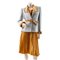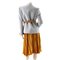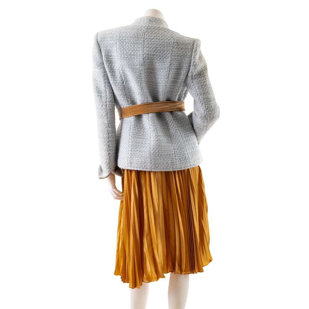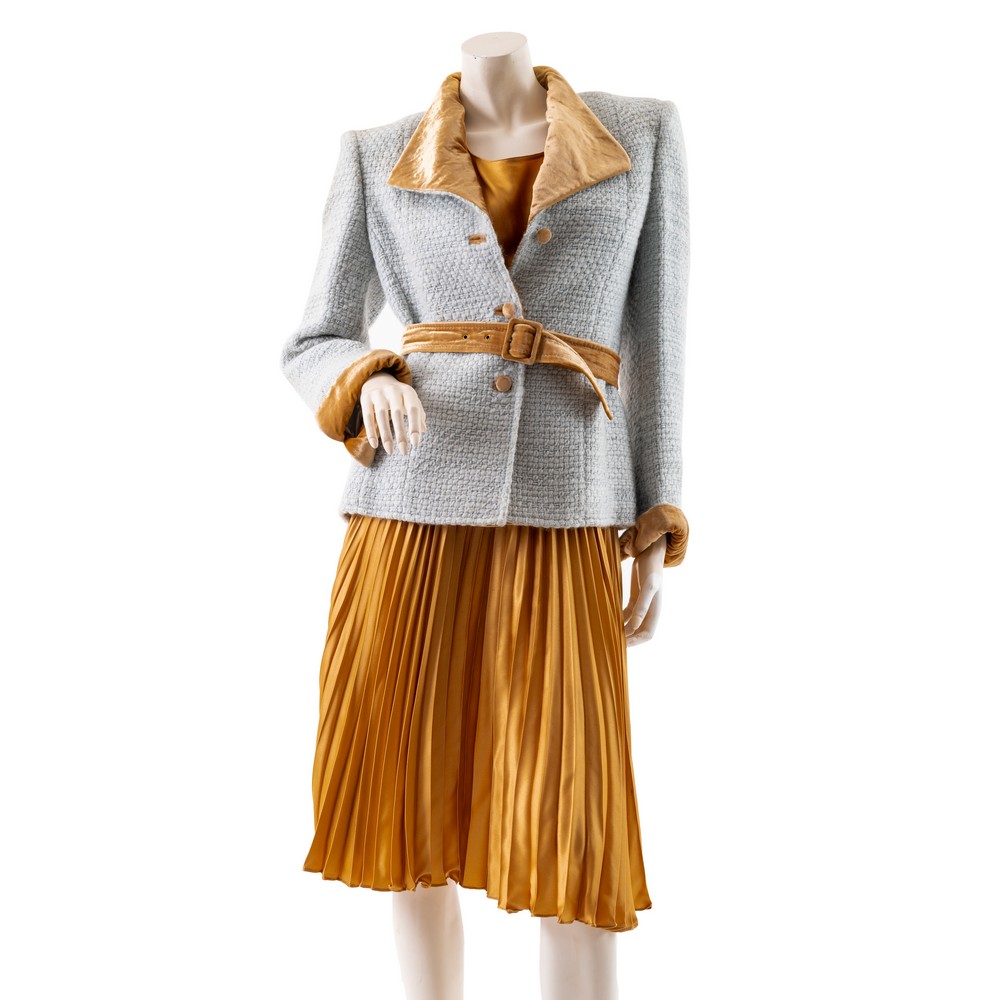 Tailleur composto da tre pezzi, giacca in boucle di lana celeste con polsi e collo in velluto ocra, bottoni foderati e cintura alla vita, un sotto giacca in seta ocra, una gonna lunga in seta plissè. Etichetta di produzione. Taglia M.