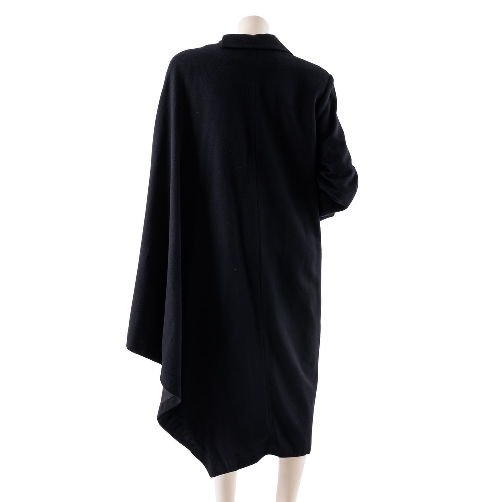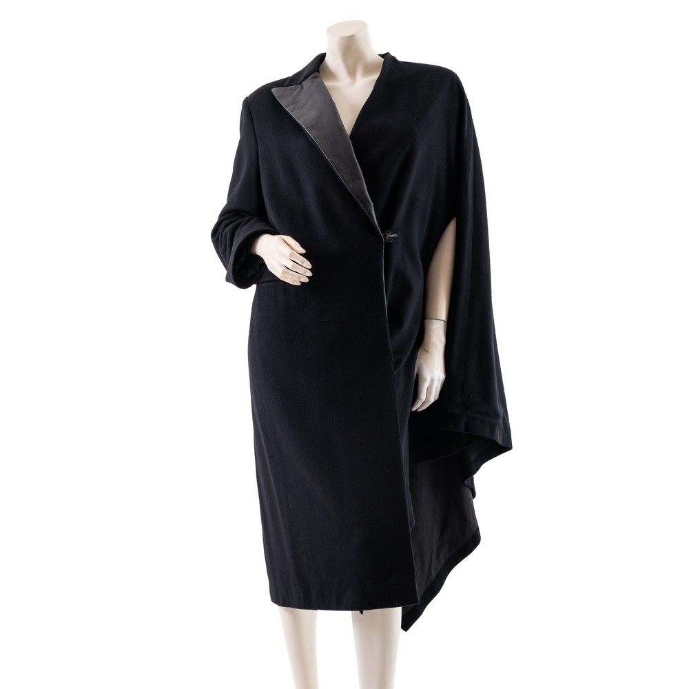 Cappotto in lana e cachemire nero con doppio taglio, metà taglio retto con collo a lancia in pelle e metà taglio mantella. Etichetta di produzione. Taglia 44.