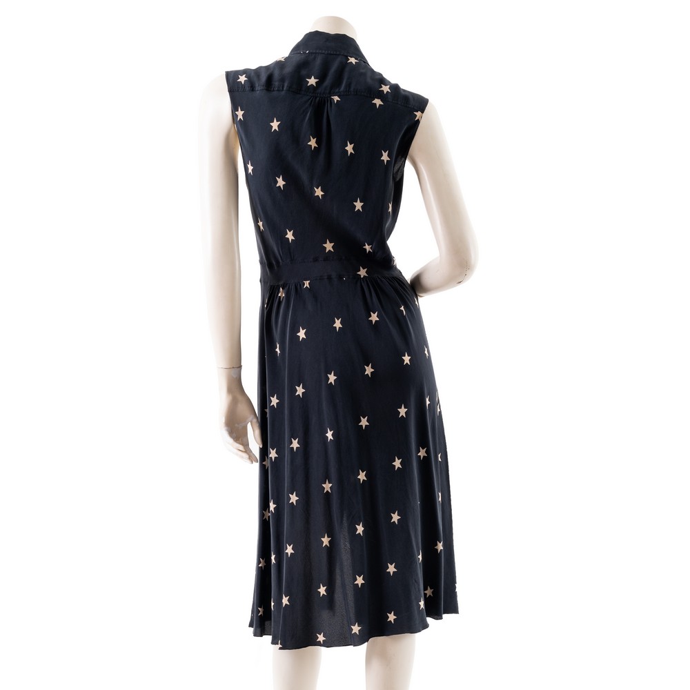 Abito in seta smanicato fondo nero con stelle bianche, abbottonatura sul davanti. Segni d’uso. Etichetta di produzione. Taglia S.